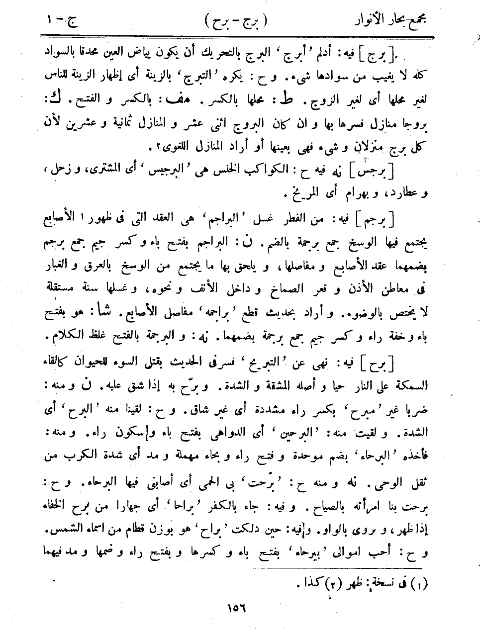 [برجم] فيه: من الفطر غسل "البراجم" هي العقد التي في ظهور الأصابع يجتمع فيها الوسخ جمع برجمة بالضم. ن: البراجم بفتح باء وكسر جيم جمع برجم بضمهما عقد الأصابع ومفاصلها، ويلحق بها ما يجتمع من الوسخ بالعرق والغبار في معاطن الأذن وقعر الصماخ وداخل الأنف ونحوه، وغسلها سنة مستقلة لا يختص بالوضوء. وأراد بحديث قطع "براجمه" مفاصل الأصابع. شا: هو بفتح باء وخفة راء وكسر جيم جمع برجمة بضمهما. نه: والبرجمة بالفتح غلظ الكلام.