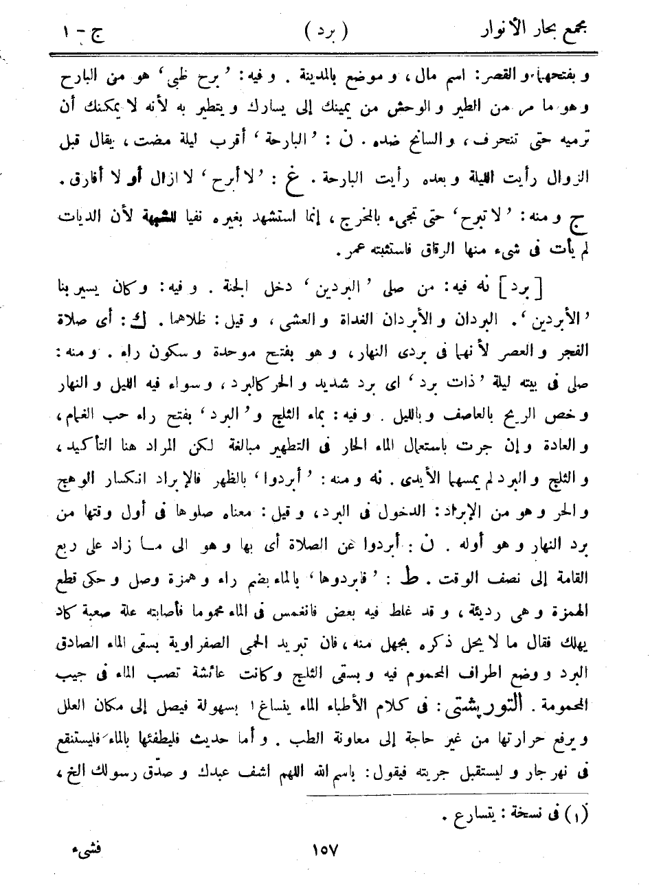 [برد] نه فيه: من صلى "البردين" دخل الجنة. وفيه: وكان يسير بنا "الأبردين". البردان والأبردان الغداة والعشي، وقيل: ظلاهما. ك: أي صلاة الفجر والعصر لأنهما في بردي النهار، وهو بفتح موحدة وسكون راء. ومنه: صلى في بيته ليلة "ذات برد" أي برد شديد والحر كالبرد، وسواء فيه الليل والنهار وخص الريح بالعاصف وبالليل. وفيه: بماء الثلج و"البرد" بفتح راء حب الغمام، والعادة وإن جرت باستعمال الماء الحار في التطهير مبالغة لكن المراد هنا التأكيد، والثلج والبرد لم يمسهما الأيدي. نه ومنه: "أبردوا" بالظهر فالإبراد انكسار الوهج والحر وهو من الإبراد: الدخول في البرد، وقيل: معناه صلوها في أول وقتها من برد النهار وهو أوله. ن: أبردوا عن الصلاة أي بها وهو إلى ما زاد على ربع القامة إلى نصف الوقت. ط: "فابردوها" بالماء بضم راء وهمزة وصل وحكى قطع الهمزة وهي رديئة، وقد غلط فيه بعض فانغمس في الماء محموماً فأصابته علة صعبة كاد يهلك فقال ما لا يحل ذكره بجهل منه، فإن تبريد الحمى الصفراوية بسقي الماء الصادق البرد ووضع أطراف المحموم فيه وبسقي الثلج وكانت عائشة تصب الماء في جيب المحمومة. التوربشتي: في كلام الأطباء الماء ينساغ بسهولة فيصل إلى مكان العلل ويرفع حرارتها من غير حاجة إلى معاونة الطب. وأما حديث فليطفئها بالماء فليستنقع في نهر جار وليستقبل جريته فيقول: باسم الله اللهم اشف عبدك وصدق رسولك إلخ،
