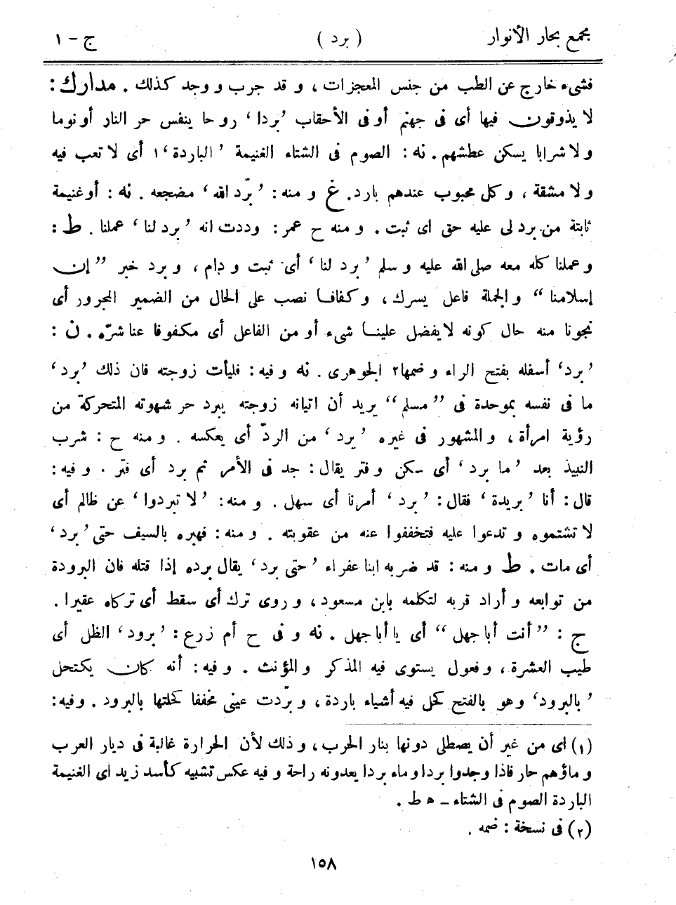 فشئ خارج عن الطب من جنس المعجزات، وقد جرب ووجد كذلك. مدارك: لا يذوقون فيها أي في جهنم أو في الأحقاب "برداً" روحاً ينفس حر النار أو نوماً ولا شراباً يسكن عطشهم. نه: الصوم في الشتاء الغنيمة "الباردة" أي لا تعب فيه ولا مشقة، وكل محبوب عندهم بارد. غ ومنه: "برد الله" مضجعه. نه: أو غنيمة ثابتة من برد لي عليه حق أي ثبت. ومنه ح عمر: وددت أنه "برد لنا" عملنا. ط: وعملنا كله معه صلى الله عليه وسلم "برد لنا" أي ثبت ودام، وبرد خبر "إن إسلامنا" والجملة فاعل يسرك، وكفافاً نصب على الحال من الضمير المجرور أي نجونا منه حال كونه لا يفضل علينا شيء أو من الفاعل أي مكفوفاً عناشره. ن: "برد" أسفله بفتح الراء وضمها الجوهري. نه وفيه: فليأت زوجته فإن ذلك "برد" ما في نفسه بموحدة في "مسلم" يريد أن إتيانه زوجته يبرد حر شهوته المتحركة من رؤية امرأة، والمشهور في غيره "يرد" من الرد أي يعكسه. ومنه ح: شرب النبيذ بعد "ما برد" أي سكن وفتر يقال: جد في الأمر ثم برد أي فتر. وفيه: قال: أنا "بريدة" فقال: "برد" أمرنا أي سهل. ومنه: "لا تبردوا" عن ظالم أي لا تشتموه وتدعوا عليه فتخففوا عنه من عقوبته. ومنه: فهبره بالسيف حتى "برد" أي مات. ط ومنه: قد ضربه ابنا عفراء "حتى برد" يقال برده إذا قتله فإن البرودة من توابعه وأراد قربه لتكلمه بابن مسعود، وروى ترك أي سقط أي تركاه عقيراً. ج: "أنت أبا جهل" أي يا أبا جهل. نه وفي ح أم زرع: "برود" الظل أي طيب العشرة، وفعول يستوي فيه المذكر والمؤنث. وفيه: أنه كان يكتحل "بالبرود" وهو بالفتح كحل فيه أشياء باردة، وبردت عيني مخففاً كحلتها بالبرود. وفيه: