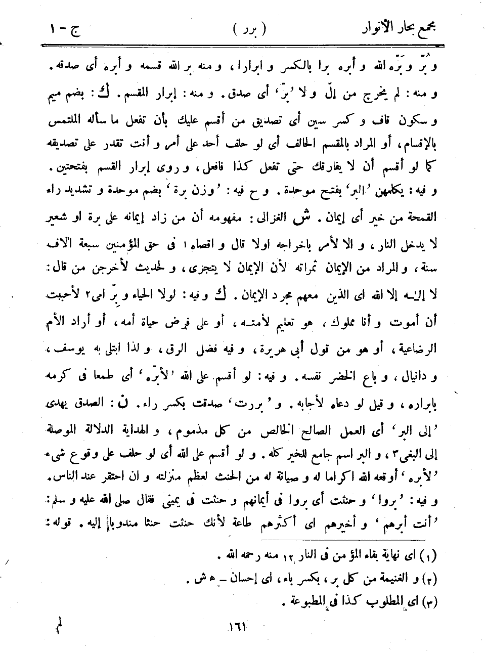 وبر وبره الله وأبره برا بالكسر وابرارا، ومنه بر الله قسمه وأبره أي صدقه. ومنه: لم يخرج من إل ولا "بر" أي صدق. ومنه: إبرار المقسم. ك: بضم ميم وسكون قاف وكسر سين أي تصديق من أقسم عليك بأن تفعل ما سأله الملتمس بالإقسام، أو المراد بالمقسم الحالف أي لو حلف أحد على أمر وأنت تقدر على تصديقه كما لو أقسم أن لا يفارقك حتى تفعل كذا فافعل، وروى إبرار القسم بفتحتين. وفيه: يكلمهن "البر" بفتح موحدة. وح فيه: "وزن برة" بضم موحدة وتشديد راء القمحة من خير أي إيمان. ش الغزالي: مفهومه أن من زاد إيمانه على برة أو شعير لا يدخل النار، وإلا لأمر بإخراجه أولاً قال وأقصاه في حق المؤمنين سبعة آلاف سنة، والمراد من الإيمان ثمراته لأن الإيمان لا يتجزى، ولحديث لأخرجن من قال: لا إله إلا الله الذين معهم مجرد الإيمان. ك وفيه: لولا الحياء وبر امي لأحببت أن أموت وأنا مملوك، هو تعليم لأمته، أو على فرض حياة أمه، أو أراد الأم الرضاعية، أو هو من قول أبي هريرة، وفيه فضل الرق، ولذا ابتلى به يوسف، ودانيال، وباع الخضر نفسه. وفيه: لو أقسم على الله "لأبره" أي طمعاً في كرمه بإبراره، وقيل لو دعاه لأجابه. و"بررت" صدقت بكسر راء. ن: الصدق يهدي "إلى البر" أي العمل الصالح الخالص من كل مذموم، والهداية الدلالة الموصلة إلى البغي، والبراسم جامع للخير كله. ولو أقسم على الله أي لو حلف على وقوع شيء "لأبره" أوقعه الله إكراماً له وصيانة له من الحنث لعظم منزلته وأن احتقر عند الناس. وفيه: "بروا" وحنثت أي بروا في أيمانهم وحنثت في يميني فقال صلى الله عليه وسلم: "أنت أبرهم" وأخيرهم أي أكثرهم طاعة لأنك حنثت حنثاً مندوباً إليه. قوله: