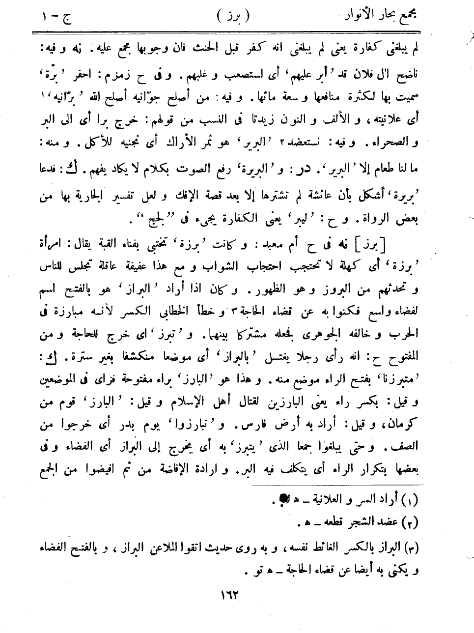 لم يبلغني كفارة يعني لم يبلغني أنه كفر قبل الحنث فإن وجوبها مجمع عليه. نه وفيه: ناضح آل فلان قد "أبر عليهم" أي استصعب وغلبهم. وفي ح زمزم: احفر "برة" سميت بها لكثرة منافعها وسعة مائها. وفيه: من أصلح جوانيه أصلح الله "برانيه" أي علانيته، والألف والنون زيدتا في النسب من قولهم: خرج برا أي إلى البر والصحراء. وفيه: نستعضد "البرير" هو ثمر الأراك أي نجنيه للأكل. ومنه: ما لنا طعام إلا "البرير". در: و"البريرة" رفع الصوت بكلام لا يكاد يفهم. ك: فدعا "بريرة" أشكل بأن عائشة لم تشترها إلا بعد قصة الإفك ولعل تفسير الجارية بها من بعض الرواة. وح: "ليبر" يعني الكفارة يجيء في "لجج".