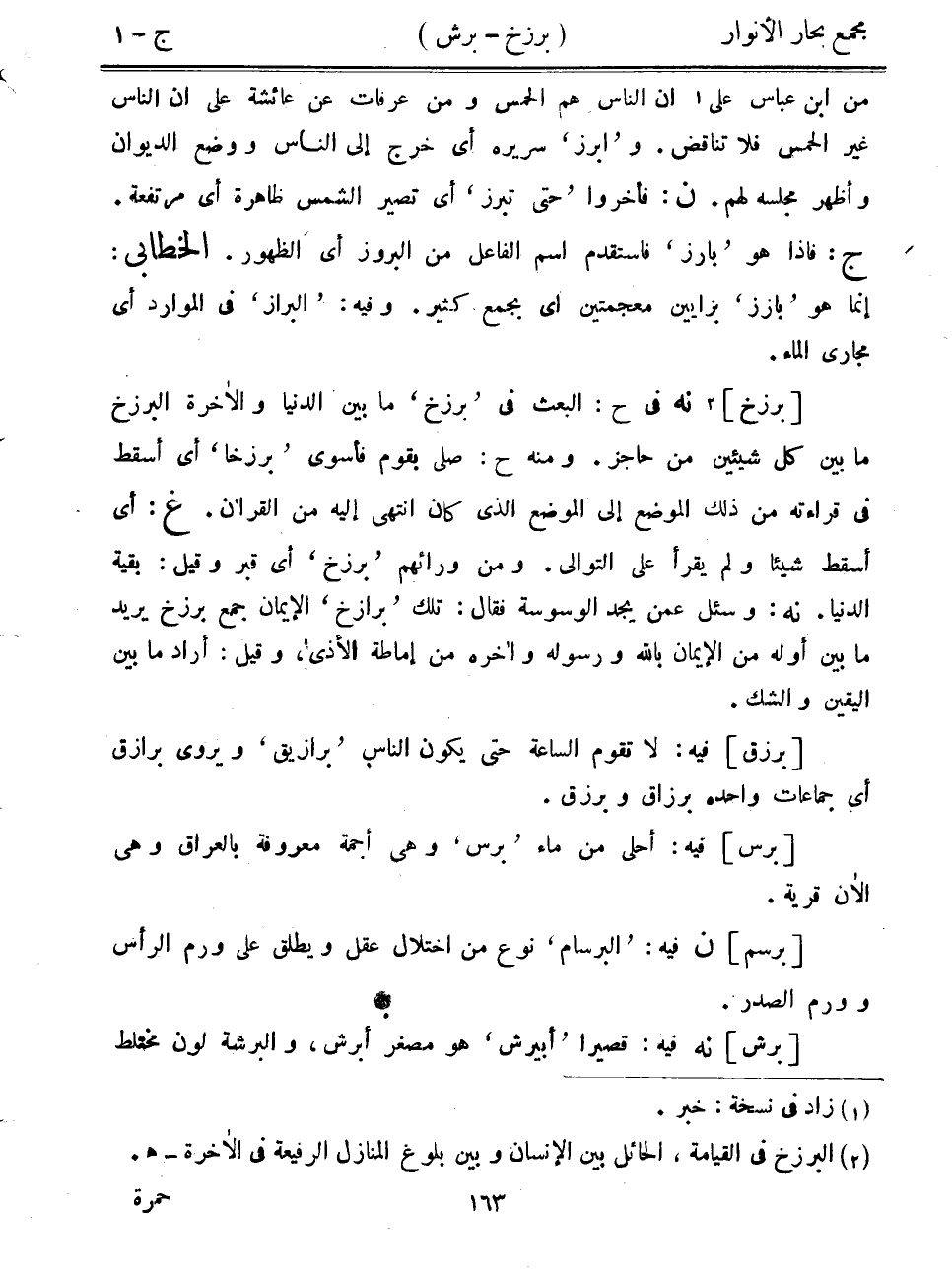 [برزخ] نه في ح: البعث في "برزخ" ما بين الدنيا والأخرة البرزخ ما بين كل شيئين من حاجز. ومنه ح: صلى بقوم فأسوى "برزخا" أي أسقط في قراءته من ذلك الموضع إلى الموضع الذي كان انتهى إليه من القرآن. غ: أي أسقط شيئاً ولم يقرأ على التوالي. ومن ورائهم "برزخ" أي قبر وقيل: بقية الدنيا. نه: وسئل عمن يجد الوسوسة فقال: تلك "برازخ" الإيمان جمع برزخ يريد ما بين أوله من الإيمان بالله ورسوله وأخره من إماطة الأذى، وقيل: أراد ما بين اليقين والشك.