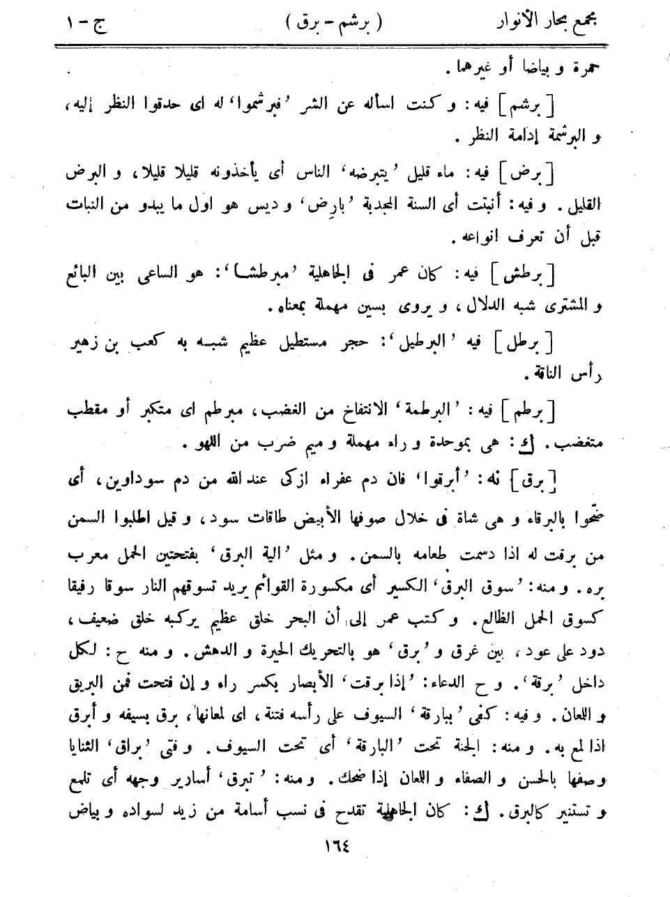 [برق] نه: "أبرقوا" فإن دم عفراء أزكى عند الله من دم سوداوين، أي ضحوا بالبرقاء وهي شاة في خلال صوفها الأبيض طاقات سود، وقيل اطلبوا السمن من برقت له إذا دسمت طعامه بالسمن. ومثل "ألية البرق" بفتحتين الحمل معرب بره. ومنه: "سوق البرق" الكسير أي مكسورة لاقوائم يريد تسوقهم النار سوقاً رفيقاً كسوق الحمل الظالع. وكتب عمر إلى أن البحر خلق عظيم يركبه خلق ضعيف، دود على عود، بين غرق و"برق" هو بالتحريك الحيرة والدهش. ومنه ح: لكل داخل "برقة". وح الدعاء: "إذا برقت" الأبصار بكسر راء وإن فتحت فمن البريق واللمعان. وفيه: كفى "ببارقة" السيوف على رأسه فتنة، أي لمعانها، برق بسيفه وأبرق إذا لمع به. ومنه: الجنة تحت "البارقة" أي تحت السيوف. وفتى "براق" الثنايا وصفها بالحسن والصفاء واللمعان إذا ضحك. ومنه: "تبرق" أسارير وجهه أي تلمع وتستنير كالبرق. ك: كان الجاهلية تقدح في نسب أسامة من زيد لسواده وبياض