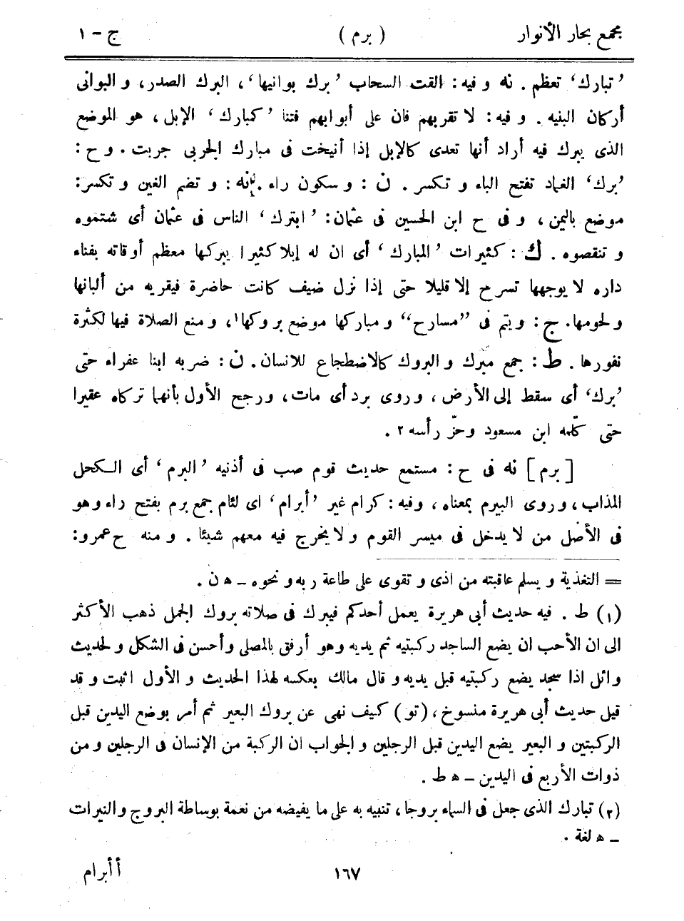 "تبارك" تعظم. نه وفيه: ألقت السحاب "برك بوانيها"، البرك الصدر، والبواني أركان البنيه. وفيه: لا تقربهم فإن على أبوابهم فتنا "كمبارك" الإبل، هو الموضع الذي يبرك فيه أراد أنها تعدى كالإبل إذا أنيخت في مبارك الجربي جربت. وح: "برك" الغماد تفتح الباء وتكسر. ن: وسكون راء. نه: وتضم الغين وتكسر: موضع باليمن، وفي ح ابن الحسين في عثمان: "ابترك" الناس في عثمان أي شتموه وتنقصوه. ك: كثيرات "المبارك" أي أن له إبلاً كثيراً ببركها معظم أوقاته بفناء داره لا يوجهها تسرح إلا قليلاً حتى إذا نزل ضيف كانت حاضرة فيقريه من ألبانها ولحومها. ج: ويتم في "مسارح" ومباركها موضع بروكها، ومنع الصلاة فيها لكثرة نفورها. ط: جمع مبرك والبروك كالاضطجاع للإنسان. ن: ضربه ابنا عفراء حتى "برك" أي سقط إلى الأرض، وروى برد أي مات، ورجح الأول بأنهما تركاه عقيراً حتى كلمه ابن مسعود وحز رأسه.