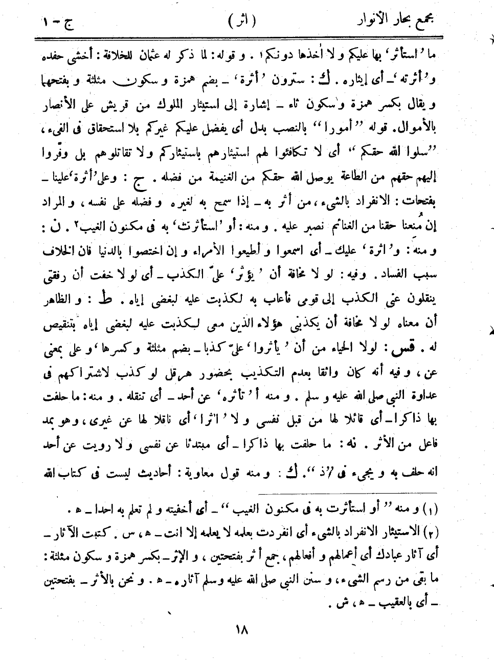 ما "استأثر" بها عليكم ولا أخذها دونكم. وقوله: لما ذكر له عثمان للخلافة: أخشى حفده و"أثرته"- أي إيثاره. ك: سترون "أثره"- بضم همزة وسكون مثلثة وبفتحهما ويقال بكسر همزة وسكون ثاء- إشارة إلى استيثار الملوك من قريش على الأنصار بالأموال. قوله "أموراً" بالنصب بدل أي يفضل عليكم غيركم بلا استحقاق في الفيء، "سلوا الله حقكم" أي لا تكافئوا لهم استيثارهم باستيثاركم ولا تقاتلوهم بل وفروا إليهم حقهم من الطاعة يوصل الله حقكم من الغنيمة من فضله. ج: وعلى "أثره" علينا- بفتحات: الانفراد بالشيء، من أثر به- إذا سمح به لغيره وفضله على نفسه، والمراد إن منعنا حقنا من الغنائم نصبر عليه. ومنه: أو "استأثرت" به في مكنون الغيب. ن: ومنه: و"أثرة" عليك- أي اسمعوا وأطيعوا الأمراء وإن اختصوا بالدنيا فإن الخلاف سبب الفساد. وفيه: لولا مخافة أن "يؤثر" على الكذب- أي لولا خفت أن رفقتي ينقلون عني الكذب إلى قومي فأعاب به لكذبت عليه لبغضي إياه. ط: والظاهر أن معناه لولا مخافة أن يكذبني هؤلاء الذين معي لكذبت عليه لبغضي إياه بتنقيص له. قس: لولا الحياء من أن "يأثروا" علي كذباً- بضم مثلثة وكسرها، وعلى بمعنى عن، وفيه أنه كان واثقاً بعدم التكذيب بحضور هرقل لو كذب لاشتراكهم في عداوة النبي صلى الله عليه وسلم. ومنه أ "تأثره" عن أحد- أي تنقله. ومنه: ما حلفت بها ذاكراً- أي قائلاً لها من قبل نفسي ولا "أثراً" أي ناقلاً لها عن غيري، وهو بمد فاعل من الأثر. نه: ما حلفت بها ذاكراً- أي مبتدئاً عن نفسي ولا رويت عن أحد أنه حلف به ويجيء في "ذ". ك: ومنه قول معاوية: أحاديث ليست في كتاب الله