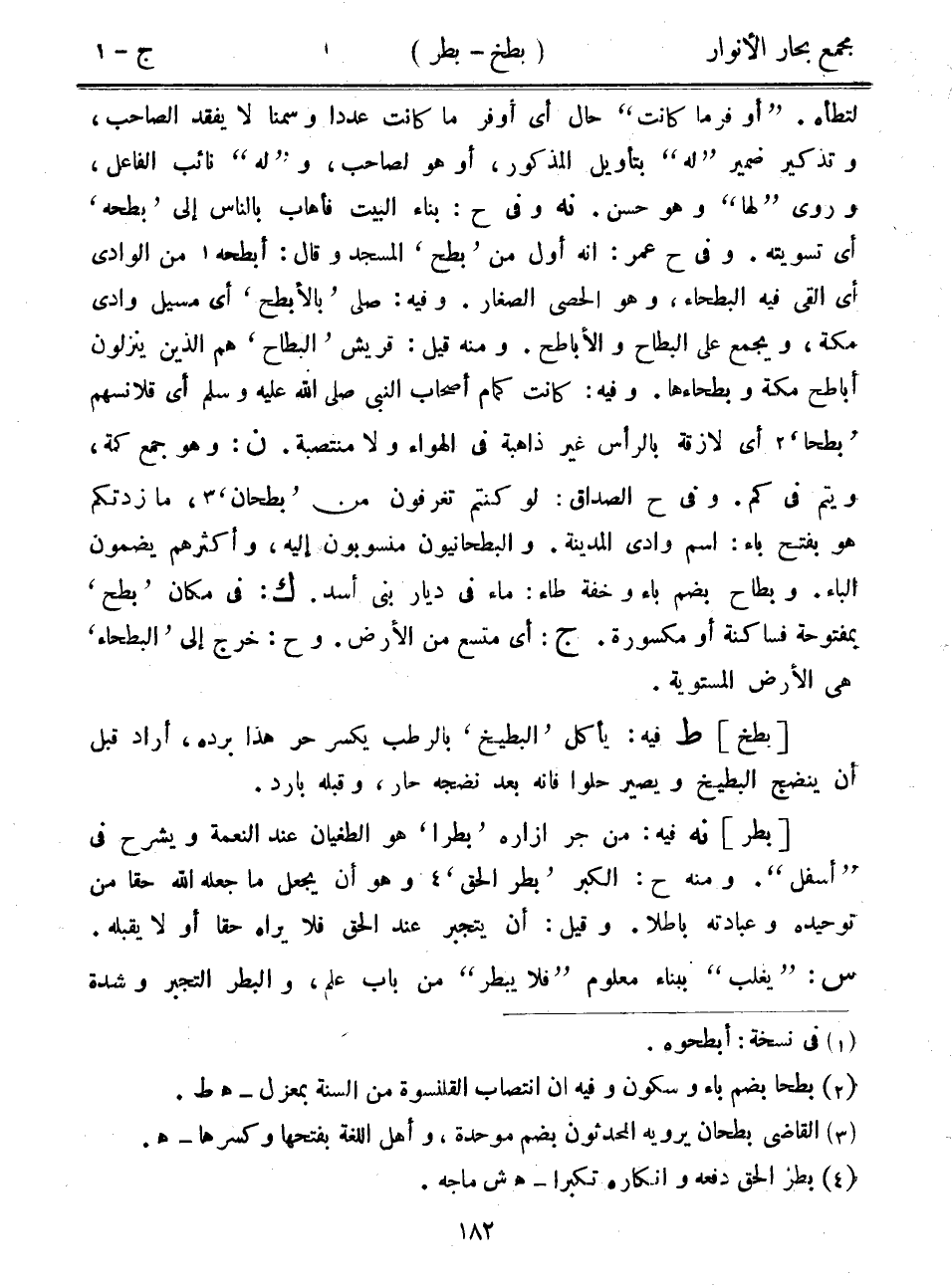 لتطأه. "أو فرما كانت" حال أي أوفر ما كانت عدداً وسمناً لا يفقد الصاحب، وتذكير ضمير "له" بتأويل المذكور، أو هو لصاحب، و"له" نائب الفاعل، وروى "لها" وهو حسن. نه وفي ح: بناء البيت فأهاب بالناس إلى "بطحه" أي تسويته. وفي ح عمر: أنه أول من "بطح" المسجد وقال: أبطحه من الوادي أي ألقى فيه البطحاء، وهو الحصى الصغار. وفيه: صلى "بالأبطح" أي مسيل وادي مكة، ويجمع على البطاح والأباطح. ومنه قيل: قريش "البطاح" هم الذين ينزلون أباطح مكة وبطحاءها. وفيه: كانت كمام أصحاب النبي صلى الله عليه وسلم أي قلانسهم "بطحا" أي لازقة بالرأس غير ذاهبة في الهواء ولا منتصبة. ن: وهو جمع كمة، ويتم في كم. وفي ح الصداق: لو كنتم تغرفون من "بطحان"، ما زدتكم هو بفتح باء: اسم وادي المدينة. والبطحانيون منسوبون إليه، وأكثرهم يضمون الباء. وبطاح بضم باء وخفة طاء: ماء في ديار بني أسد. ك: في مكان "بطح" بمفتوحة فساكنة أو مكسورة. ج: أي متسع من الأرض. وح: خرج إلى "البطحاء" هي الأرض المستوية.