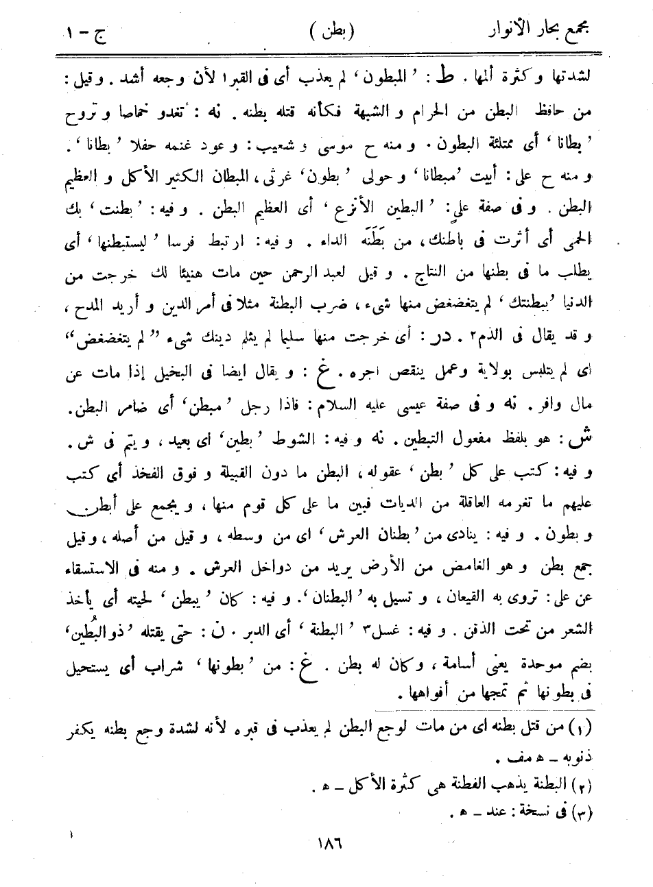 لشدتها وكثرة ألمها. ط: "المبطون" لم يعذب أي في القبر لأن وجعه أشد. وقيل: من حافظ البطن من الحرام والشبهة فكأنه قتله بطنه. نه: تغدو خماصاً وتروح "بطانا" أي ممتلئة البطون. ومنه ح موسى وشعيب: وعود غنمه حفلاً "بطانا". ومنه ح على: أبيت "مبطانا" وحولى "بطون" غرثى، المبطان الكثير الأكل والعظيم البطن. وفي صفة على: "البطين الأنزع" أي العظيم البطن. وفيه: "بطنت" بك الحمى أي أثرت في باطنك، من بطنه الداء. وفيه: ارتبط فرساً "ليستبطنها" أي يطلب ما في بطنها من النتاج. وقيل لعبد الرحمن حين مات هنيئاً لك خرجت من الدنيا "ببطنتك" لم يتغضغض منها شيء، ضرب البطنة مثلاً في أمر الدين وأريد المدح، وقد يقال في الذم. در: أي خرجت منها سلمياً لم يثلم دينك شيء "لم يتغضغض" أي لم يتلبس بولاية وعمل ينقص أجره. غ: ويقال أيضاً في البخيل إذا مات عن مال وافر. نه وفي صفة عيسى عليه السلام: فإذا رجل "مبطن" أي ضامر البطن. ش: هو بلفظ مفعول التبطين. نه وفيه: الشوط "بطين" أي بعيد، ويتم في ش. وفيه: كتب على كل "بطن" عقوله، البطن ما دون القبيلة وفوق الفخذ أي كتب عليهم ما تغرمه العاقلة من الديات فبين ما على كل قوم منها، ويجمع على أبطن وبطون. وفيه: ينادي من "بطنان العرش" أي من وسطه، وقيل من أصله، وقيل جمع بطن وهو الغامض من الأرض يريد من دواخل العرش. ومنه في الاستسقاء عن علي: تروى به القيعان، وتسيل به "البطنان". وفيه: كان "يبطن" لحيته أي يأخذ الشعر من تحت الذقن. وفيه: غسل "البطنة" أي الدبر. ن: حتى يقتله "ذو البطين" بضم موحدة يعني أسامة، وكان له بطن. غ: من "بطونها" شراب أي يستحيل في بطونها ثم تمجها من أفواهها.