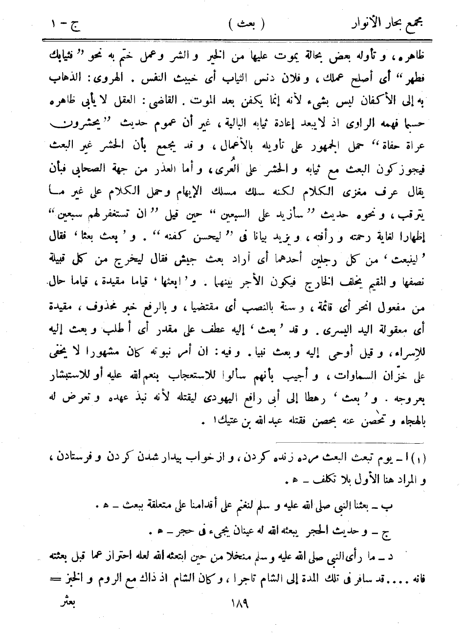 ظاهره، وتأوله بعض بحالة يموت عليها من الخير والشر وعمل ختم به نحو "فثيابك فطهر" أي أصلح عملك، وفلان دنس الثياب أي خبيث النفس. الهروى: الذهاب به إلى الأكفان ليس بشيء لأنه إنما يكفن بعد الموت. القاضي: العقل لا يأبى ظاهره حسبما فهمه الراوي إذ لا يبعد إعادة ثيابه البالية، غير أن عموم حديث "يحشرون عراة حفاة" حمل الجمهور على تأويله بالأعمال، وقد يجمع بأن الحشر غير البعث فيجوز كون البعث مع ثيابه والحشر على العرى، وأما العذر من جهة الصحابي فبأن يقال عرف مغزى الكلام لكنه سلك مسلك الإيهام وحمل الكلام على غير ما يترقب، ونحوه حديث "سأزيد على السبعين" حين قيل "أن تستغفر لهم سبعين" إظهاراً لغاية رحمته ورأفته، ويزيد بياناً في "ليحسن كفنه". و"بعث بعثاً" فقال "لينبعث" من كل رجلين أحدهما أي أراد بعث جيش فقال ليخرج من كل قبيلة نصفها والمقيم يخلف الخارج فيكون الأجر بينهما. و"ابعثها" قياماً مقيدة، قياماً حال من مفعول انحر أي قائمة، وسنة بالنصب أي مقتضياً، وبالرفع خبر محذوف، مقيدة أي معقولة اليد اليسرى. وقد "بعث" إليه عطف على مقدر أي أطلب وبعث إليه للإسراء، وقيل أوحى إليه وبعث نبياً. وفيه: أن أمر نبوته كان مشهوراً لا يخفى على خزان السماوات، وأجيب بأنهم سألوا للاستعجاب بنعم الله عليه أو للاستبشار بعروجه. و"بعث" رهطاً إلى أبي رافع اليهودي ليقتله لأنه نبذ عهده وتعرض له بالهجاء وتحصن عنه بحصن فقتله عبد الله بن عتيك.