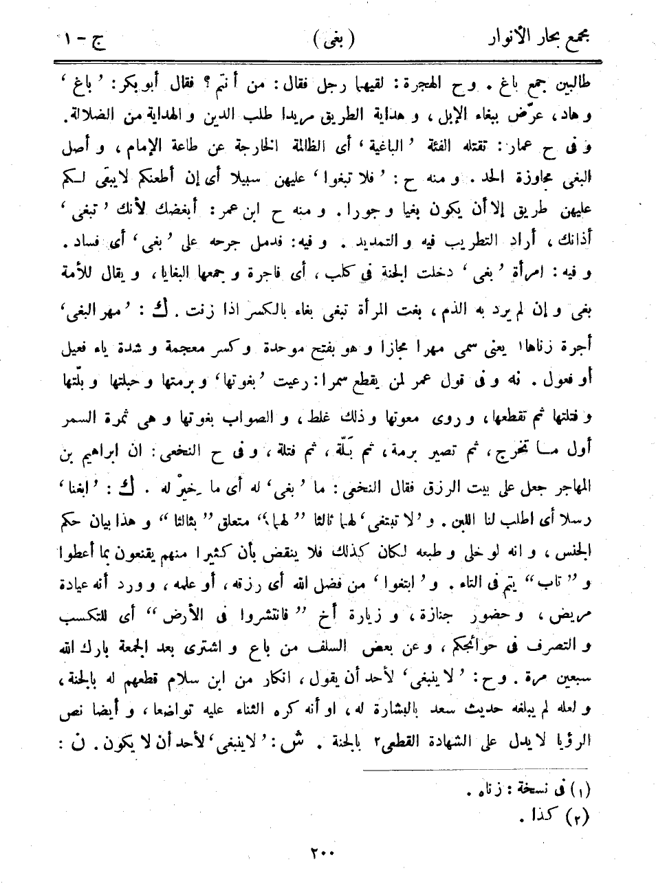 طالبين جمع باغ. وح الهجرة: لقيهما رجل فقال: من أنتم؟ فقال أبو بكر: "باغ" وهاد، عرض ببغاء الإبل، وهداية الطريق مريداً طلب الدين والهداية من الضلالة. وفي ح عمار: تقتله الفئة "الباغية" أي الظالمة الخارجة عن طاعة الإمام، وأصل البغي مجاوزة الحد. ومنه ح: "فلا تبغوا" عليهن سبيلاً أي إن أطعنكم لا يبقى لكم عليهن طريق إلا أن يكون بغياً وجوراً. ومنه ح ابن عمر: أبغضك لأنك "تبغي" أذانك، أراد التطريب فيه والتمديد. وفيه: فدمل جرحه على "بغي" أي فساد. وفيه: امرأة "بغي" دخلت الجنة في كلب، أي فاجرة وجمعها البغايا، ويقال للأمة بغي وإن لم يرد به الذم، بغت المرأة تبغى بغاء بالكسر إذا زنت. ك: "مهر البغي" أجرة زناها يعني سمي مهراً مجازاً وهو بفتح موحدة وكسر معجمة وشدة ياء فعيل أو فعول. نه وفي قول عمر لمن يقطع سمرا: رعيت "بغوتها" وبرمتها وحبلتها وبلتها وفتلتها ثم تقطعها، وروى معوتها وذلك غلط، والصواب بغوتها وهي ثمرة السمر أول ماتخرج، ثم تصير برمة، ثم بلة، ثم فتلة، وفي ح النخعي: أن إبراهيم بن المهاجر جعل على بيت الرزق فقال النخعي: ما "بغي" له أي ما خير له. ك: "ابغنا" رسلاً أي اطلب لنا اللبن. و"لا تبتغي" لهما ثالثاً "لهما" متعلق "بثالثا" وهذا بيان حكم الجنس، وأنه لو خلى وطبعه لكان كذلك فلا ينقض بأن كثيراً منهم يقنعون بما أعطوا و"تاب" يتم في التاء. و"ابتغوا" من فضل الله أي رزقه، أو علمه، وورد أنه عيادة مريض، وحضور جنازة، وزيارة أخ "فانتشروا في الأرض" أي للتكسب والتصرف في حوائجكم، وعن بعض السلف من باع واشترى بعد الجمعة بارك الله سبعين مرة. وح: "لا ينبغي" لأحد أن يقول، إنكار من ابن سلام قطعهم له بالجنة، ولعله لم يبلغه حديث سعد بالبشارة له، أو أنه كره الثناء عليه تواضعاً، وأيضاً نص الرؤيا لا يدل على الشهادة القطعي بالجنة. ش: "لا ينبغي" لأحد أن لا يكون. ن: