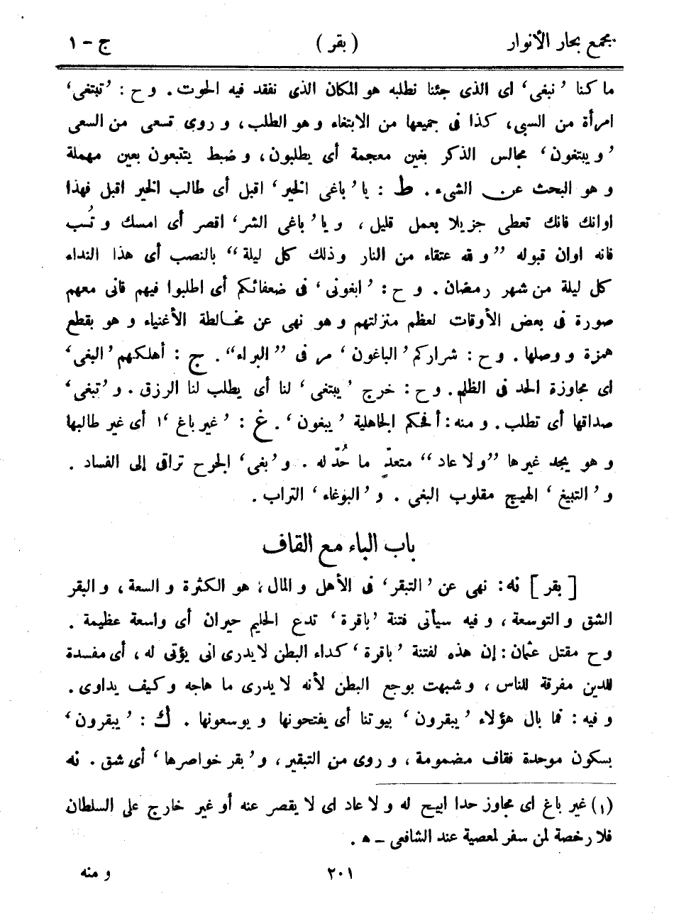 ما كنا "نبغي" أي الذي جئنا نطلبه هو المكان الذي نفقد فيه الحوت. وح: "تبتغي" امرأة من السبي، كذا في جميعها من الابتغاء وهو الطلب، وروى تسعى من السعي "ويبتغون" مجالس الذكر بغين معجمة أي يطلبون، وضبط يتتبعون بعين مهملة وهو البحث عن الشيء. ط: يا "باغي الخير" أقبل أي طالب الخير أقبل فهذا أوانك فإنك تعطى جزيلاً بعمل قليل، ويا "باغي الشر" اقصر أي امسك وتُب فإنه أوان قبوله "ولله عتقاء من النار وذلك كل ليلة" بالنصب أي هذا النداء كل ليلة من شهر رمضان. وح: "ابغوني" في ضعفائكم أي اطلبوا فيهم فإني معهم صورة في بعض الأوقات لعظم منزلتهم وهو نهي عن مخالطة الأغنياء وهو بقطع همزة ووصلها. وح: شراركم "الباغون" مر في "البراء". ج: أهلكهم "البغي" أي مجاوزة الحد في الظلم. وح: خرج "يبتغي" لنا أي يطلب لنا الرزق. و"تبغي" صداقها أي تطلب. ومنه: أفحكم الجاهلية "يبغون". غ: "غير باغ" أي غير طالبها وهو يجد غيرها "ولا عاد" متعد ما حد له. و"بغى" الجرح تراقى إلى الفساد. و"التبيغ" الهيج مقلوب البغي. و"البوغاء" التراب.