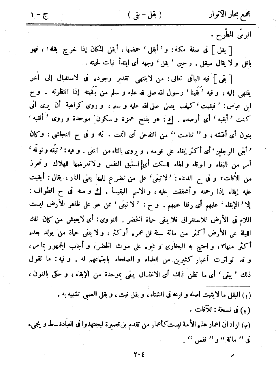 [بقى] فيه الباقي تعالى: من لا ينتهي تقدير وجوده في الاستقبال إلى آخر ينتهي إليه، وفيه "بقينا" رسول الله صلى الله عليه وسلم من بقيته إذا انتظرته. وح ابن عباس: "فبقيت" كيف يصلي صلى الله عليه وسلم، وروى كراهية أن يرى أني كنت "أبقيه" أي أرصده. ك: هو بفتح همزة وسكون موحدة وروى "أنقبه" بنون أي أفتشه، و"تتامت" من التفاعل أي أتمت. نه وفي ح النجاشي: وكان "أبقى الرجلين" أي أكثر إبقاء على قومه، ويروى بالتاء من التقى. وفيه: "تبقه وتوقه" أمر من البقاء والوقاء والهاء للسكت أي استبق النفس ولا تعرضها للهلاك وتحرز من الآفات وفي ح الدعاء: "لا تبقى" على من تضرع إليها يعني النار، يقال: أبقيت عليه إبقاء إذا رحمته وأشفقت عليه، والاسم البقيا. ك ومنه في ح الطواف: إلا "الإبقاء" عليهم أي رفقاً عليهم. وح: "لا تبقى" ممن هو على ظاهر الأرض ليست اللام في الأرض للاستغراق فلا ينفي حياة الخضر. النووي: أي لا يعيش من كان تلك على الأرض أكثر من مائة سنة قل عمره أو كثر، ولا ينفي حياة من يولد بعده أكثر منها، واحتج به البخاري وغيره على موت الخضر، وأجاب الجمهور بما مر، وقد تواترت أخبار كثيرين من العلماء والصلحاء باجتماعهم له. وفيه: ما تقول ذلك "يبقى" أي ما تظن ذلك أي الاغتسال يبقى بموحدة من الإبقاء، وحكى بالنون،