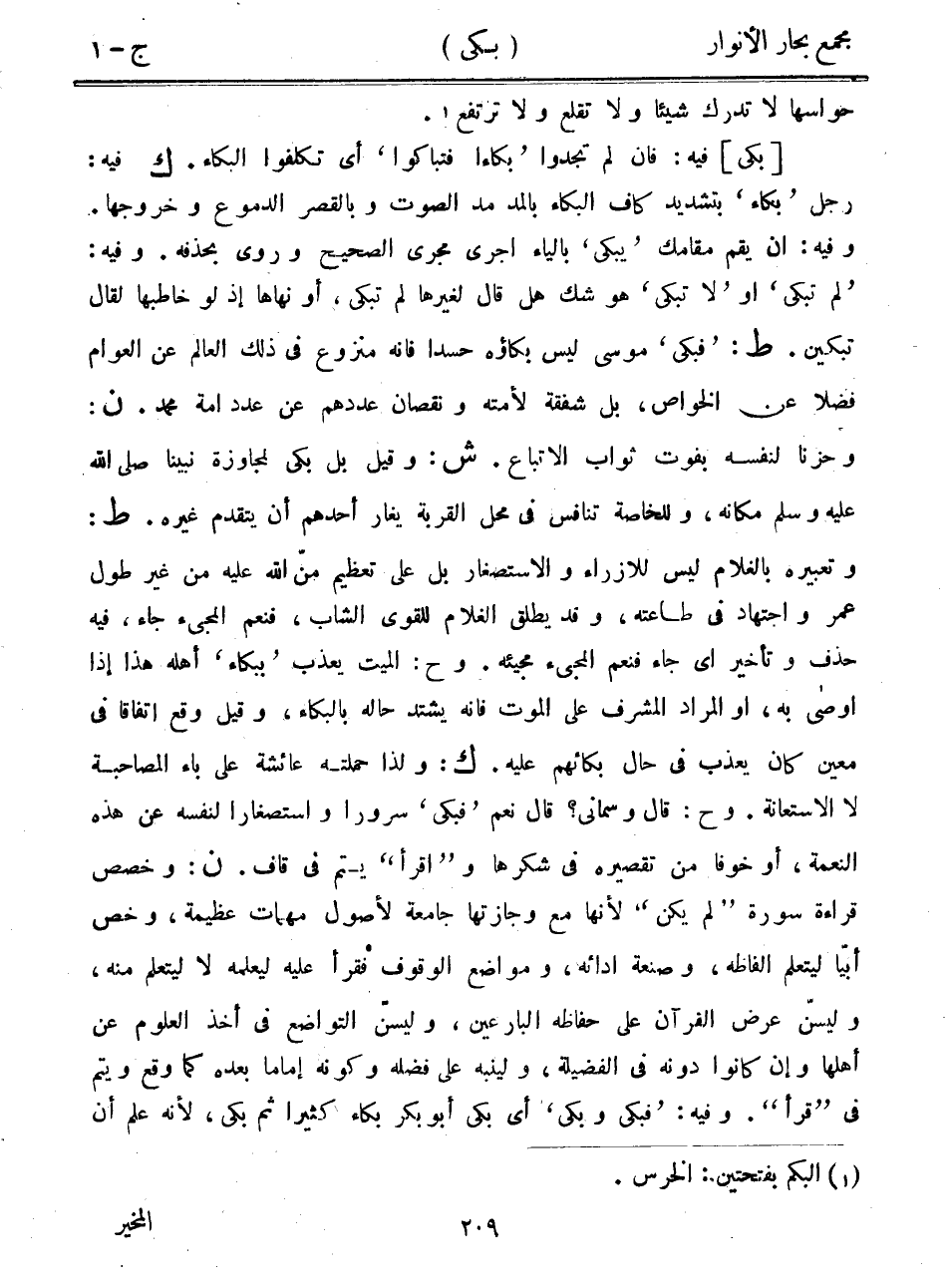 [بكى] فيه: فإن لم تجدوا "بكاءاً فتباكوا" أي تكلفوا البكاء. ك فيه: رجل "بكاء" بتشديد كاف البكاء بالمد مد الصوت وبالقصر الدموع وخروجها. وفيه: أن يقم مقامك "يبكي" بالياء أجرى مجرى الصحيح وروى بحذفه. وفيه: "لم تبكي" أو "لا تبكي" هو شك هل قال لغيرها لم تبكي، أو نهاها إذ لو خاطبها لقال تبكين. ط: "فبكى" موسى ليس بكاؤه حسداً فإنه منزوع في ذلك العالم عن العوام فضلاً عن الخواص، بل شفقة لأمته ونقصان عددهم عن عدد أمة محمد. ن: وحزناً لنفسه بفوت ثواب الإتباع. ش: وقيل بل بكى لمجاوزة نبينا صلى الله عليه وسلم مكانه، وللخاصة تنافس في محل القربة يغار أحدهم أن يتقدم غيره. ط: وتعبيره بالغلام ليس للازراء والاستصغار بل على تعظيم من الله عليه من غير طول عمر واجتهاد في طاعته، وقد يطلق الغلام للقوي الشاب، فنعم المجيء جاء، فيه حذف وتأخير أي جاء فنعم المجيء مجيئه. وح: الميت يعذب "ببكاء" أهله هذا إذا أوصى به، أو المراد المشرف على الموت فإنه يشتد حاله بالبكاء، وقيل وقع اتفاقاً في معين كان يعذب في حال بكائهم عليه. ك: ولذا حملته عائشة على باء المصاحبة لا الاستعانة. وح: قال وسماني؟ قال نعم "فبكى" سروراً واستصغاراً لنفسه عن هذه النعمة، أو خوفاً من تقصيره في شكرها و"اقرأ" يتم في قاف. ن: وخصص قراءة سورة "لم يكن" لأنها مع وجازتها جامعة لأصول مهمات عظيمة، وخص أبياً ليتعلم ألفاظه، وصنعة أدائه، ومواضع الوقوف فقرأ عليه ليعلمه لا ليتعلم منه، وليس عرض القرآن على حفاظه البارعين، وليسن التواضع في أخذ العلوم عن أهلها وإن كانوا دونه في الفضيلة، ولينبه على فضله وكونه إماماً بعده كما وقع ويتم في "قرأ". وفيه: "فبكى وبكى" أي بكى أبو بكر بكاء كثيراً ثم بكى، لأنه علم أن