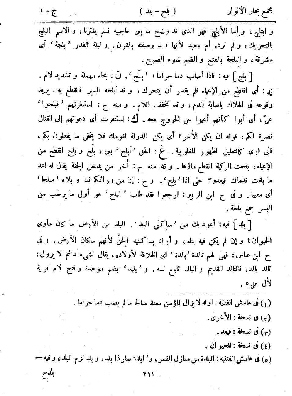 [بلج] فيه: فإذا أصاب دماً حراماً "بلح". ن: بحاء مهملة وتشديد لام. نه: أي انقطع من الإعياء فلم يقدر أن يتحرك، وقد أبلحه السير فانقطع به، يريد وقوعه في الهلاك بإصابة الدم، وقد تخفف اللام. ومنه ح: استنفرتهم "فبلحوا" علي، أي أبوا كأنهم أعيوا عن الخروج معه. ك: استنفرت أي دعوتهم إلى القتال نصرة لكم، قوله أن يكن الآخر أي يكن الدولة لقومك فلا يخفى ما يفعلون بكم، فأني أرى كالتعليل لظهور المغلوبية. غ: الحق "أبلح" بين، بلح وبلح انقطع من الإعياء، بلحت الركية انقطع ماؤها. ونه منه ح: آخر من يدخل الجنة يقال له أعد ما بلغت قدماك فيعدو حتى إذا "بلح". وح: إن من ورائكم فتناً وبلاء "مبلحاً" أي معيباً. وفي ح ابن الزبير: ارجعوا فقد طاب "البلح" هو أول ما يرطب من البسر جمع بلحة.