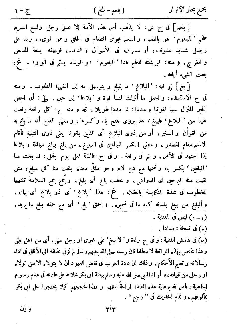 [بلغ] نه فيه: "البلاغ" ما يتبلغ ويتوصل به إلى الشيء المطلوب. ومنه في ح الاستسقاء: واجعل ما أنزلت لنا قوة و"بلاغاً" إلى حين. ط: أي اجعل الخير المنزل سبباً لقوتنا ومدداً لنا مدداً طويلاً. نه ومنه ح: كل رافعة رفعت علينا من "البلاغ" فليبلغ عنا يروى بفتح باء وكسرها، ومعنى الفتح أنه ما بلغ به من القرآن والسنن، أو من ذوي البلاغ أي الذين بلغونا يعني ذوي التبليغ فأقام الاسم مقام المصدر، ومعنى الكسر المبالغين في التبليغ، من بالغ يبالغ مبالغة وبلاغاً إذا اجتهد في الأمر، ويتم في رافعة. وفي ح عائشة لعلي يوم الجمل: قد بلغت منا "البلغين" بكسر باء وضمها مع فتح لام وهو مثل معناه بلغت منا كل مبلغ، مثل لقيت منه البرحين أي الدواهي، وخطب بلغ أي بليغ، وجمع جمع السلامة تشبيهاً للخطوب في شدة النكاية بالعقلاء. غ: هذا "بلاغ" أي ذو بلاغ أي بيان. والبليغ من يبلغ بلسانه كنه ما في ضميره. وأحمق "بلغ" أي مع حمقه يبلغ ما يريد.
