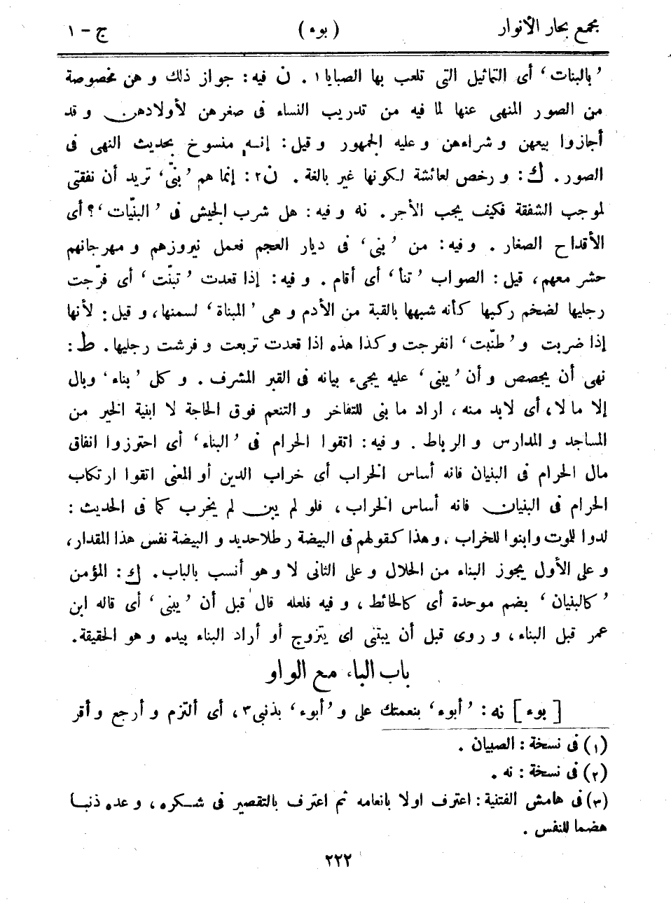 "بالبنات" أي التماثيل التي تلعب بها الصبايا. ن فيه: جواز ذلك وهن مخصوصة من الصور المنهي عنها لما فيه من تدريب النساء في صغرهن لأولادهن وقد أجازوا بيعهن وشراءهن وعليه الجمهور وقيل: إنه منسوخ بحديث النهي في الصور. ك: ورخص لعائشة لكونها غير بالغة. ن: إنما هم "بني" تريد أن نفقتي لموجب الشفقة فكيف يجب الأجر. نه وفيه: هل شرب الجيش في "البنيات"؟ أي الأقداح الصغار. وفيه: من "بنى" في ديار العجم فعمل نيروزهم ومهرجانهم حشر معهم، قيل: الصواب "تنأ" أي أقام. وفيه: إذا قعدت "تبنت" أي فرجت رجليها لضخم ركبها كأنه شبهها بالقبة من الأدم وهي "المبناة" لسمنها، وقيل: لأنها إذا ضربت و"طنبت" انفرجت وكذا هذه إذا قعدت تربعت وفرشت رجليها. ط: نهى أن يجصص وأن "يبنى" عليه يجيء بيانه في القبر المشرف. وكل "بناء" وبال إلا مالا، أي لابد منه، أراد ما بنى للتفاخر والتنعم فوق الحاجة لا أبنية الخير من المساجد والمدارس والرباط. وفيه: اتقوا الحرام في "البناء" أي احترزوا إنفاق مال الحرام في البنيان فإنه أساس الخراب أي خراب الدين أو المعنى اتقوا ارتكاب الحرام في البنيان فإنه أساس الخراب، فلو لم يبن لم يخرب كما في الحديث: لدوا للموت وابنوا للخراب. وهذا كقولهم في البيضة رطلاً حديد والبيضة نفس هذا المقدار، وعلى الأول يجوز البناء من الحلال وعلى الثاني لا وهو أنسب بالباب. ك: المؤمن "كالبنيان" بضم موحدة أي كالحائط، وفيه فلعله قال قبل أن "يبنى" أي قاله ابن عمر قبل البناء، وروى قبل أن يبتنى أي يتزوج أو أراد البناء بيده وهو الحقيقة.
