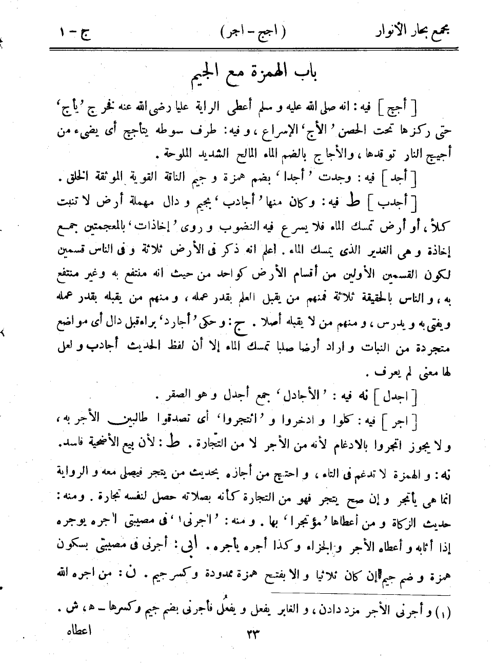 [أجر] فيه: كلوا وادخلوا و"ائتجروا" أي تصدقوا طالبين الأجر به، ولا يجوز اتجروا بالإدغام لأنه من الأجر لا من التجارة. ط: لأن بيع الأضحية فاسد. نه: والهمزة لا تدغم في التاء، واحتج من أجازه بحديث من يتجر فيصلي معه والرواية إنما هي يأتجر وإن صح يتجر فهو من التجارة كأنه بصلاته حصل لنفسه تجارة. ومنه: حديث الزكاة ومن أعطاها "مؤتجراً" بها. ومنه: "أجرني" في مصيبتي أجره يؤجره إذا أثابه وأعطاه الأجر والجزاء وكذا أجره يأجره. أبى: أجرني في مصيبتي بسكون همزة وضم جيم إن كان ثلاثياً وإلا بفتح همزة ممدودة وكسر جيم. ن: من آجره الله