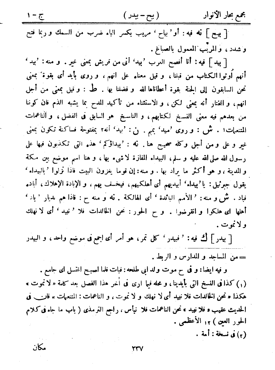 [بيد] فيه: أنا أفصح العرب "بيد" أني من قريش بمعنى غير. ومنه: "بيد" أنهم أوتوا الكتاب من قبلنا، وقيل معناه على أنهم، وروى بأيد أي بقوة بمعنى نحن السابقون إلى الجنة بقوة أعطاناها الله وفضلنا بها. ط: وقيل بمعنى من أجل أنهم، والمختار أنه بمعنى لكن، والاستثناء من تأكيد المدح بما يشبه الذم فإن كوننا من بعدهم فيه معنى النسخ لكتابهم، والناسخ هو السابق في الفضل، والناعمات المتنعمات. ش: وروى "ميد" بميم. ن: "بيد" أنه بمفتوحة فساكنة تكون بمعنى غير وعلى ومن أجل وكله صحيح هنا. نه: "بيداؤكم" هذه التي تكذبون فيها على رسول الله صلى الله عليه وسلم، البيداء المفازة لا شيء بها، وهنا اسم موضع بين مكة والمدينة، وهو أكثر ما يراد بها. ومنه: إن قوماً يغزون البيت فإذا نزلوا "بالبيداء" يقول جبرئيل: يا "بيداء" أبيديهم أي أهلكيهم، فيخسف بهم، والإبادة الإهلاك، أباده فباد. ش ومنه: "الأمم البائدة" أي الهالكة. نه ومنه ح: فإذا هم بديار "باد" أهلها أي هلكوا وانقرضوا. وح الحور: نحن الخالدات فلا "نبيد" أي لا نهلك ولا نموت.