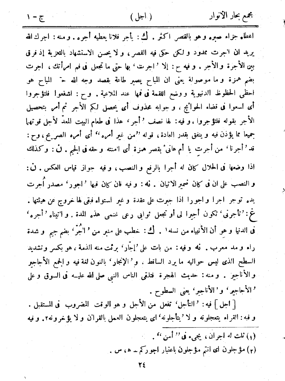 أعطاه جزاء صبره وهو بالقصر أكثر. ك: يأجر فلاناً يعطيه أجره. ومنه: أجرك الله يريد أن أجرت ممدود ولكن حكى فيه القصر، ولا يحسن الاستشهاد بالتعزية إذ فرق بين الأجرة والأجر. وفيه ح: إلا "أجرت" بها حتى ما تجعل في فم امرأتك، أجرت بضم همزة وما موصولة يعني أن المباح يصير طاعة بقصد وجه الله حتى المباح هو أحظى الحظوظ الدنيوية ووضع اللقمة في فمها عند الملاعبة. وح: اشفعوا فلتؤجروا أي اسعوا في قضاء الحوائج، وجوابه محذوف أي يحصل لكم الأجر ثم أمر بتحصيل الأجر بقوله فلتؤجروا، وفيه: لها نصف "أجر" هذا في طعام البيت المعد لأجل قوتهما جميعاً مما يؤذن فيه وينفق بقدر العادة، قوله "من غير أمره" أي أمره الصريح، وح: قد "أجرنا" من أجرت يا أم هانئ بقصر همزة أي أمنته وحقه في الجيم. ن: وكذلك إذا وضعها في الحلال كان له أجراً بالرفع والنصب، وفيه جواز قياس العكس. ن: والنصب على أن في كان ضمير الإتيان. نه: وفيه فإن كان فيها "أجور" مصدر أجرت يده تؤجر أجراً وأجوراً إذا جبرت على عقدة وغير استواء فبقي لها خروج عن هيئتها. غ: "تأجرني" تكون أجيراً لي أو تجعل ثوابي رعي غنمي هذه المدة. وأتيناه "أجره" في الدنيا وهو أن الأنبياء من نسله. ك: خطب على منبر من "أجر" بضم جيم وشدة راء ومد معرب. نه وفيه: من بات على "إجار" برئت منه الذمة، هو بكسر وتشديد السطح الذي ليس حواليه ما يرد الساقط. و"الإنجار" بالنون لغة فيه والجمع الأجاجير والأناجير. ومنه: حديث الهجرة فتلقى الناس النبي صلى الله عليه في السوق وعلى "الأجاجير" و"الأناجير" يعني السطوح.