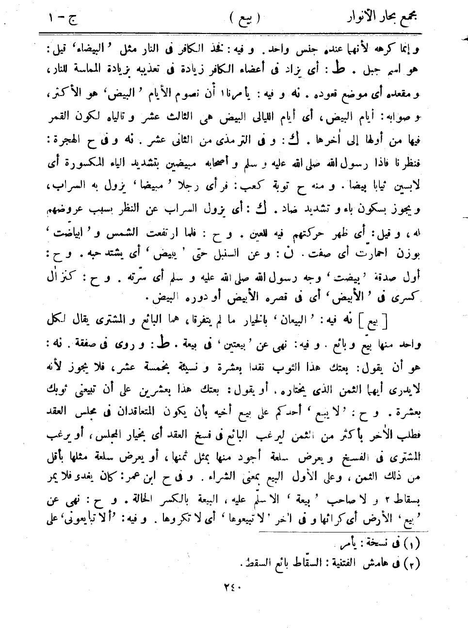 [بيع] نه فيه: "البيعان" بالخيار ما لم يتفرقا، هما البائع والمشتري يقال لكل واحد منها بيع وبائع. وفيه: نهى عن "بيعتين" في بيعة. ط: وروى في صفقة. نه: هو أن يقول: بعتك هذا الثوب نقداً بعشرة ونسيئة بخمسة عشر، فلا يجوز لأنه لا يدري أيهما الثمن الذي يختاره. أو يقول: بعتك هذا بعشرين على أن تبيعني ثوبك بعشرة. وح: "لا يبع" أحدكم على بيع أخيه بأن يكون المتعاقدان في مجلس العقد فطلب الآخر بأكثر من الثمن ليرغب البائع في فسخ العقد أي بخيار المجلس، أو يرغب المشتري في الفسخ ويعرض سلعة أجود منها بمثل ثمنها، أو يعرض سلعة مثلها بأقل من ذلك الثمن، وعلى الأول البيع بمعنى الشراء. وفي ح ابن عمر: كان يغدو فلا يمر بسقاط ولا صاحب "بيعة" إلا سلم عليه، البيعة بالكسر الحالة. وح: نهى عن "بيع" الأرض أي كرائها وفي آخر "لا تبيعوها" أي لا تكروها. وفيه: "ألا تبايعوني" على