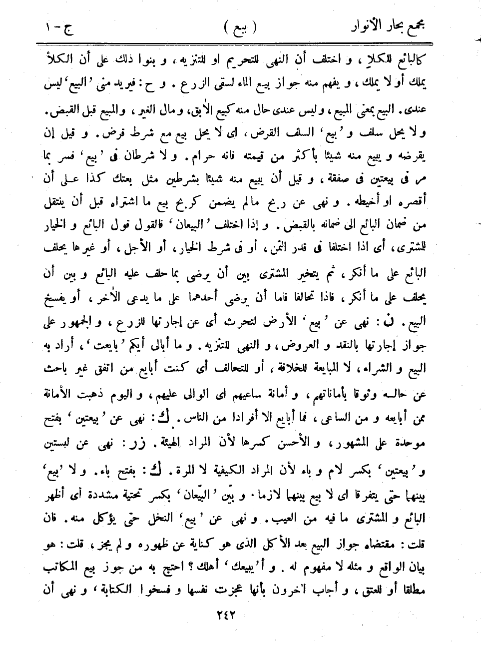 كالبائع للكلأ، واختلف أن النهي للتحريم أو للتنزيه، وبنوا ذلك على أن الكلأ يملك ولا يملك، ويفهم منه جواز بيع الماء لسقي الزرع. وح: فيريد مني "البيع" ليس عندي. البيع بمعنى المبيع، وليس عندي حال منه كبيع الأبق، ومال الغير، والمبيع قبل القبض. ولا يحل سلف و"بيع" السلف القرض، أي لا يحل بيع مع شرط قرض. وقيل إن يقرضه ويبيع منه شيئاً بأكثر من قيمته فإنه حرام. ولا شرطان في "بيع" فسر بما مر في بيعتين في صفقة، وقيل أن يبيع منه شيئاً بشرطين مثل بعتك كذا على أن أقصره أو أخيطه. ونهى عن ربح ما لم يضمن كربح بيع ما اشتراه قبل أن ينتقل من ضمان البائع إلى ضمانه بالقبض. وإذا اختلف "البيعان" فالقول قول البائع والخيار للمشتري، أي إذا اختلفا في قدر الثمن، أو في شرط الخيار، أو الأجل، أو غيرها يحلف البائع على ما أنكر، ثم يتخير المشتري بين أن يرضى بما حلف عليه البائع وبين أن يحلف على ما أنكر، فإذا تحالفا فإما أن يرضى أحدهما على ما يدعي الآخر، أو يفسخ البيع. ن: نهى عن "بيع" الأرض لتحرث أي عن إجارتها للزرع، والجمهور على جواز إجارتها بالنقد والعروض، والنهي للتنزيه. وما أبالي أيكم "بايعت"، أراد به البيع والشراء، لا المبايعة للخلافة، أو للتحالف أي كنت أبايع من اتفق غير باحث عن حاله وثوقاً بأماناتهم، وأمانة ساعيهم أي الوالي عليهم، واليوم ذهبت الأمانة ممن أبايعه ومن الساعي، فما أبايع إلا أفراداً من الناس. ك: نهى عن "بيعتين" بفتح موحدة على المشهور، والأحسن كسرها لأن المراد الهيئة. زر: نهى عن لبستين و"بيعتين" بكسر لام وباء لأن المراد الكيفية لا المرة. ك: بفتح باء. ولا "بيع" بينهما حتى يتفرقا أي لا بيع بينهما لازماً. وبين "البيعان" بكسر تحتية مشددة أي أظهر البائع والمشتري ما فيه من العيب. ونهى عن "بيع" النخل حتى يؤكل منه. فإن قلت: مقتضاه جواز البيع بعد الأكل الذي هو كناية عن ظهوره ولم يجز، قلت: هو بيان الواقع ومثله لا مفهوم له. وأ"يبيعك" أهلك؟ احتج به من جوز بيع المكاتب مطلقاً أو للعتق، وأجاب آخرون بأنها عجزت نفسها وفسخوا الكتابة، ونهى أن