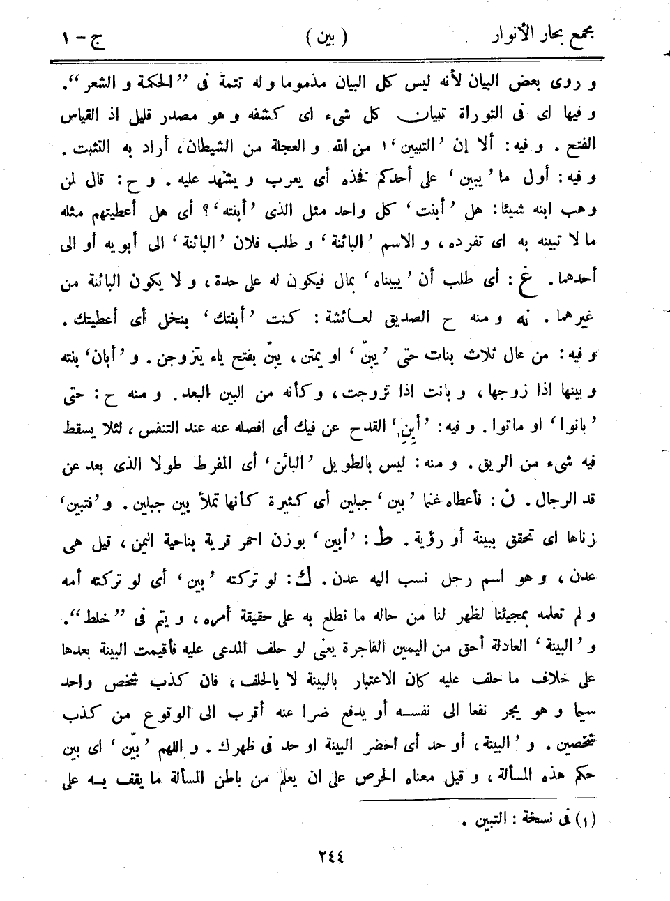 وروى بعض البيان لأنه ليس كل البيان مذموماً وله تتمة في "الحكمة والشعر". وفيها أي في التوراة تبيان كل شيء أي كشفه وهو مصدر قليل إذ القياس الفتح. وفيه: ألا إن "التبيين" من الله والعجلة من الشيطان، أراد به التثبت. وفيه: أول ما "يبين" على أحدكم فخذه أي يعرب ويشهد عليه. وح: قال لمن وهب ابنه شيئاً: هل "أبنت" كل واحد مثل الذي "أبنته"؟ أي هل أعطيتهم مثله ما لا تبينه به أي تفرده، والاسم "البائنة" وطلب فلان "البائنة" إلى أبويه أو إلى أحدهما. غ: أي طلب أن "يبيناه" بمال فيكون له على حدة، ولا يكون البائنة من غيرهما. نه ومنه ح الصديق لعائشة: كنت "أبنتك" بنخل أي أعطيتك. وفيه: من عال ثلاث بنات حتى "يبن" أو يمتن، يبن بفتح ياء يتزوجن. و"أبان" بنته وبينها إذا زوجها، وبانت إذا تزوجت، وكأنه من البين البعد. ومنه ح: حتى "بانوا" أو ماتوا. وفيه: "أبن" القدح عن فيك أي افصله عنه عند التنفس، لئلا يسقط فيه شيء من الريق. ومنه: ليس بالطويل "البائن" أي المفرط طولاً الذي بعد عن قد الرجال. ن: فأعطاه غنماً "بين" جبلين أي كثيرة كأنها تملأ بين جبلين. و"فتبين" زناها أي تحقق ببينة أو رؤية. ط: "أبين" بوزن احمر قرية بناحية اليمن، قيل هي عدن، وهو اسم رجل نسب إليه عدن. ك: لو تركته "بين" أي لو تركته أمه ولم تعلمه بمجيئنا لظهر لنا من حاله ما نطلع به على حقيقة أمره، ويتم في "خلط". و"البينة" العادلة أحق من اليمين الفاجرة يعني لو حلف المدعى عليه فأقيمت البينة بعدها على خلاف ما حلف عليه كان الاعتبار بالبينة لا بالحلف، فإن كذب شخص واحد سيما وهو يجر نفعاً إلى نفسه أو يدفع ضراً عنه أقرب إلى الوقوع من كذب شخصين. و"البينة" أو حد أي أحضر البينة أو حد في ظهرك. واللهم "بين" أي بين حكم هذه المسألة، وقيل معناه الحرص على أن يعلم من باطن المسألة ما يقف به على