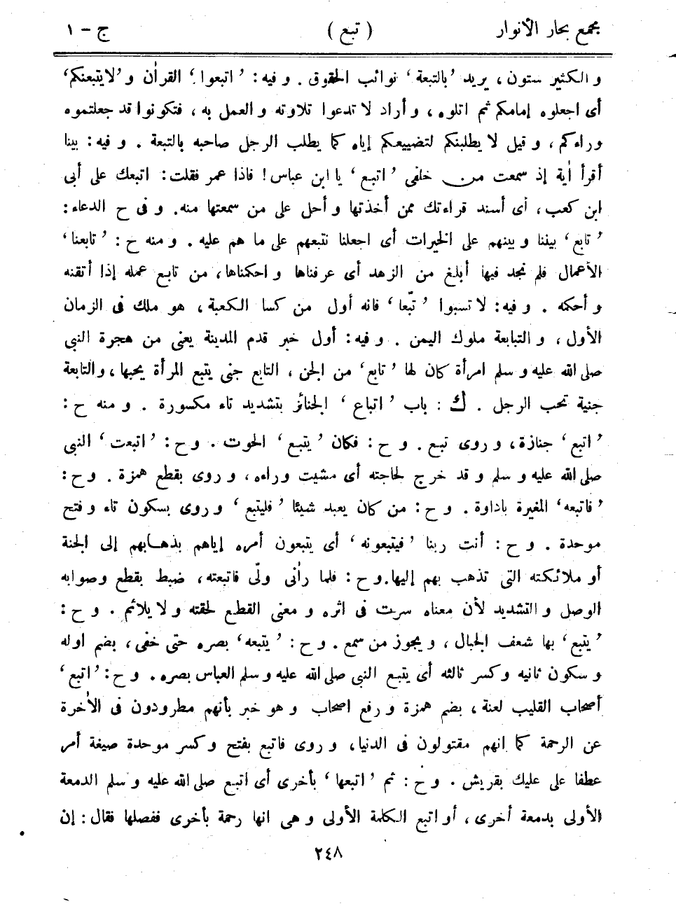 والكثير ستون، يريد "بالتبعة" نوائب الحقوق. وفيه: "اتبعوا" القرآن و"لا يتبعنكم" أي اجعلوه إمامكم ثم اتلوه، وأراد لا تدعوا تلاوته والعمل به، فتكونوا قد جعلتموه وراءكم، وقيل لا يطلبنكم لتضييعكم إياه كما يطلب الرجل صاحبه بالتبعة. وفيه: بينا أقرأ آية غذ سمعت من خلفي "اتبع" يا ابن عباس! فإذا عمر فقلت: اتبعك على أبي ابن كعب، أي أسند قراءتك ممن أخذتها وأحل على من سمعتها منه. وفي ح الدعاء: "تابع" بيننا وبينهم على الخيرات أي جعلنا نتبعهم على ما هم عليه. ومنه ح: "تابعنا" الأعمال فلم نجد فيها أبلغ من الزهد أي عرفناها واحكمناها، من تابع عمله إذا أتقنه وأحكمه. وفيه: لا تسبوا "تبعاً" فإنه أول من كسا الكعبة، هو ملك في الزمان الأول، والبابعة ملوك اليمن. وفيه: أول خبر قدم المدينة يعني من هجرة النبي صلى الله عليه وسلم امرأة كان لها "تابع" من الجن، التابع جني يتبع المرأة يحبها، والتابعة جنية تحب الرجل. ك: باب "اتباع" الجنائز بتشديد تاء مكسورة. ومنه ح: "اتبع" جنازة، وروى تبع. وح: فكان "يتبع" الحوت. وح: "اتبعت" النبي صلى الله عليه وسلم وقد خرج لحاجته أي مشيت وراءه، وروى بقطع همزة. وح: "فاتبعه" المغيرة باداوة. وح: من كان يعبد شيئاً "فليتبع" وروى بسكون تاء وفتح موحدة. وح: أنت ربنا "فيتبعونه" أي يتبعون أمره إياهم بذهابهم إلى الجنة أو ملائكته التي تذهب بهم إليها. وح: فلما رآني ولى فاتبعته، ضبط بقطع وصوابه الوصل والتشديد لأن معناه سرت في أثره ومعنى القطع لحقته ولا يلائم. وح: "يتبع" بها شعف الجبال، ويجوز من سمع. وح: "يتبعه" بصره حتى خفي، بضم أوله وسكون ثانيه وكسر ثالثه أي يتبع النبي صلى الله عليه وسلم العباس بصره. وح: "اتبع" أصحاب القليب لعنة، بضم همزة ورفع أصحاب وهو خبر بأنهم مطرودون في الآخرة عن الرحمة كما أنهم مقتولون في الدنيا، وروى فاتبع بفتح وكسر موحدة صيغة أمر عطفاً على عليك بقريش. وح: ثم "اتبعها" بأخرى أي اتبع صلى الله عليه وسلم الدمعة الأولى بدمعة أخرى، أو اتبع الكلمة الأولى وهي أنها رحمة أخرى ففصلها فقال: إن