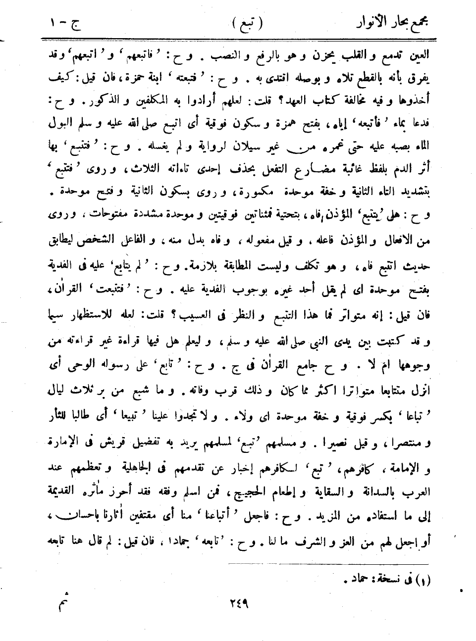 العين تدمع والقلب يحزن وهو بالرفع والنصب. وح: "فاتبعهم" و"اتبعهم" وقد يفرق بأنه بالقطع تلاه وبوصله اقتدى به. وح: "فتبعته" ابنة حمزة، فإن قيل: كيف أخذوها وفيه مخالفة كتاب العهد؟ قلت: لعلهم أرادوا به المكلفين والذكور. وح: فدعا بماء "فأتبعه" إياه، بفتح همزة وسكون فوقية أي اتبع صلى الله عليه وسلم البول الماء بصبه عليه حتى غمره من غير سيلان لرواية ولم يغسله. وح: "فتتبع" بها أثر الدم بلفظ غائبة مضارع التفعل بحذف إحدى تاءاته الثلاث، وروى "فتتبع" بتشديد التاء الثانية وخفة موحدة مكسورة، وروى بسكون الثانية وفتح موحدة. وح: هل "يتتبع" المؤذن فاه، بتحتية فمثناتين فوقيتين وموحدة مشددة مفتوحات، وروى من الأفعال والمؤذن فاعله، وقيل مفعوله، وفاه بدل منه، والفاعل الشخص ليطابق حديث اتتبع فاه، وهو تكلف وليست المطابقة بلازمة. وح: "لم يتابع" عليه في الفدية بفتح موحدة أي لم يقل أحد غيره بوجوب الفدية عليه. وح: "فتتبعت" القرآن، فإن قيل: إنه متواتر فما هذا التتبع والنظر في العسيب؟ قلت: لعله للاستظهار سيما وقد كتبت بين يدي النبي صلى الله عليه وسلم، وليعلم هل فيها قراءة غير قراءته من وجوهها أم لا. وح جامع القرآن في ج. وح: "تابع" على رسوله الوحي أي أنزل متتابعاً متواتراً أكثر مما كان وذلك قرب وفاته. وما شبع من بر ثلاث ليال "تباعاً" بكسر فوقية وخفة موحدة أي ولاء. ولا تجدوا علينا "تبيعا" أي طالباً للثأر ومنتصراً، وقيل نصيراً. ومسلمهم "تبع" لمسلمهم يريد به تفضيل قريش في الإمارة والإمامة، كافرهم، "تبع" لكافرهم إخبار عن تقدمهم في الجاهلية وتعظمهم عند العرب بالسدانة والسقاية وإطعام الحجيج، فمن أسلم وفقه فقد أحرز مأثره القديمة إلى ما استفاده من المزيد. وح: فاجعل "أتباعنا" منا أيم قتفين أثارنا بإحسان، أو اجعل لهم من العز والشرف ما لنا. وح: "تابعه" جماد، فإن قيل: لم قال هنا تابعه