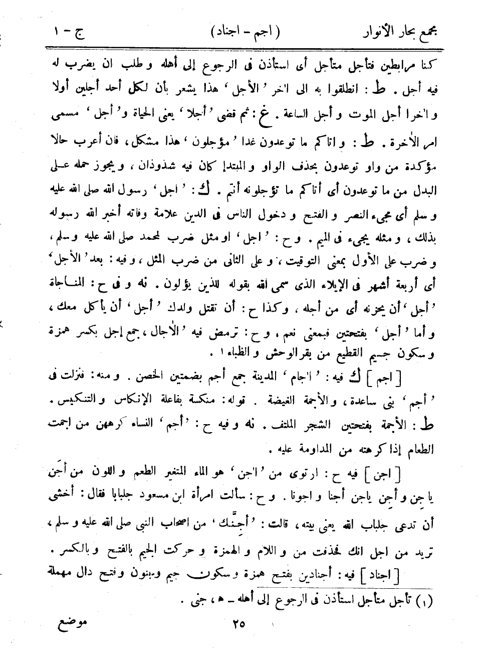 كنا مرابطين فتأجل متأجل أي استأذن في الرجوع إلى أهله وطلب أن يضرب له فيه أجل. ط: انطلقوا به إلى آخر "الأجل" هذا يشعر بأن لكل أحد أجلين أولاً وآخراً أجل الموت وأجل الساعة. غ: ثم قضى "أجلاً" يعني الحياة و"أجل" مسمى أمر الآخرة. ط: وأتاكم ما توعدون غدا "مؤجلون" هذا مشكل، فإن أعرب حالاً مؤكدة من واو توعدون بحذف الواو والمبتدأ كان فيه شذوذان، ويجوز حمله على البدل من ما توعدون أي أتاكم ما تؤجلونه أنتم. ك: "أجل" رسول الله صلى الله عليه وسلم أي مجيء النصر والفتح ودخول الناس في الدين علامة وفاته أخبر الله رسوله بذلك، ومثله يجيء في الميم. وح: "أجل" أو مثل ضرب لمحمد صلى الله عليه وسلم، وضرب على الأول بمعنى التوقيت، وعلى الثاني من ضرب المثل، وفيه: بعد "الأجل" أي أربعة أشهر في الإيلاء الذي سمى الله بقوله للذين يؤلون. نه وفي ح: المناجاة "أجل" أن يحزنه أي من أجله، وكذا ح: أن تقتل ولدك "أجل" أن يأكل معك، وأما "أجل" بفتحتيتن فبمعنى نعم، وح: ترمض فيه "الآجال، جمع إجل بكسر همزة وسكون جيم القطيع من بقر الوحش والظباء.