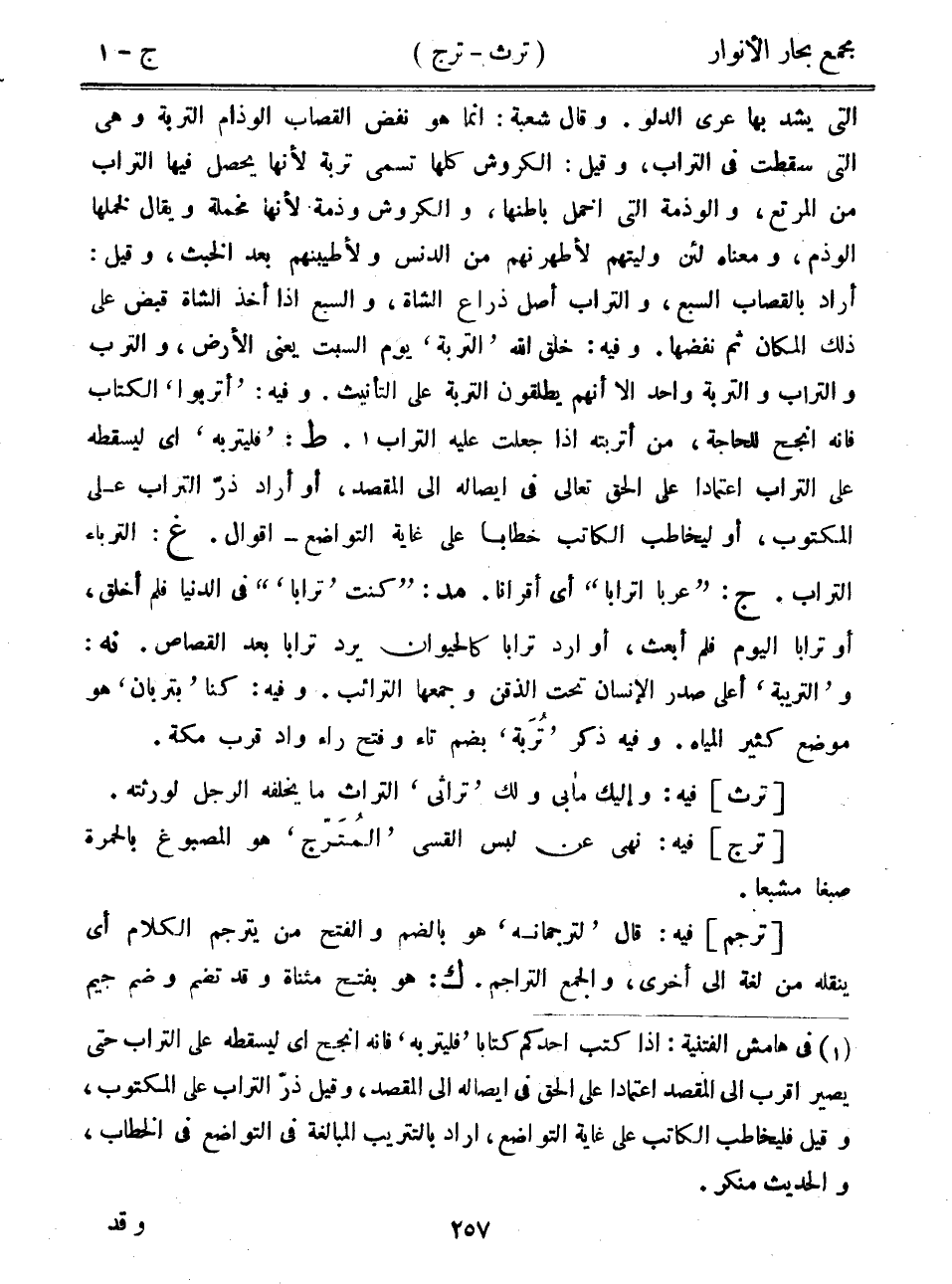 التي يشد بها عري الدلو. وقال شعبة: إنما هو نفض القصاب الوذام التربة وهي التي سقطت في التراب، وقيل: الكروش كلها تسمى تربة لأنها يحصل فيها التراب من المرتع، والوذمة التي أخمل باطنها، والكروش وذمة لأنها مخملة ويقال لخملها الوذم، ومعناه لئن وليتهم لأطهرنهم من الدنس ولأطيبنهم بعد الخبث، وقيل: أراد بالقصاب السبع، والتراب أصل ذراع الشاة، والسبع إذا أخذ الشاة قبض على ذلك المكان ثم نفضها. وفيه: خلق الله "التربة" يوم السبت يعني الأرض، والترب والتراب والتربة واحد إلا أنهم يطلقون التربة على التأنيث. وفيه: "أتربوا" الكتاب فإنه أنجح للحاجة، من أتربته إذا جعلت عليه التراب. ط: "فليتربه" أي ليسقطه على التراب اعتماداً على الحق تعالى في إيصاله إلى المقصد، أو أراد ذر التراب على المكتوب، أو ليخاطب الكاتب خطاباً على غاية التواضع- أقوال. غ: الترباء التراب. ج: "عربا أترابا" أي أقرانا. مد: "كنت "ترابا"" في الدنيا فلم أخلق، أو تراباً اليوم فلم أبعث، أو أرد تراباً كالحيوان يرد تراباً بعد القصاص. نه: و"التربية" أعلى صدر الإنسان تحت الذقن وجمعها الترائب. وفيه: كنا "بتربان" هو موضع كثير المياه. وفيه ذكر "تربة" بضم تاء وفتح راء واد قرب مكة.