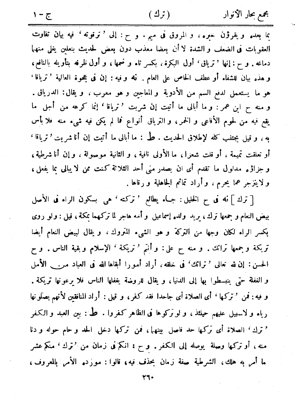 [ترك] نه في ح الخليل: جاء يطالع "تركته" هي بسكون الراء في الأصل بيض النعام وجمعها ترك، يريد ولده إسماعيل وأمه هاجر لما تركهما بمكة، قيل: ولو روى بكسر الراء لكان وجهاً من التركة وهو الشيء المتروك، ويقال لبيضا لنعام أيضاً تريكة وجمعها ترائك. ومنه ح على: وأنتم "تريكة" الإسلام وبقية الناس. وح الحسن: إن لله تعالى "ترائك" في خلقه، أراد أموراً أبقاها الله في العباد من الأمل والغفلة حتى ينبسطوا بها إلى الدنيا، ويقال للروضة يغفلها الناس فلا يرعونها تريكة. وفيه: فمن "تركها" أي الصلاة أي جاحداً فقد كفر، وقيل: أراد المنافقين لأنهم يصلونها رياء ولا سبيل عليهم حينئذ، ولو تركوها في الظاهر كفروا. ط: بين العبد والكفر "ترك" الصلاة أي تركها حد فاصل بينهما، فمن تركها دخل الحد وحام حوله ودنا منه، أو تركها وصلة يوصله إلى الكفر. وح: أنكم في زمان من "ترك" منكم عشر ما أمر به هلك، الشرطية صفة زمان بحذف فيه، قالوا: مورده الأمر بالمعروف،