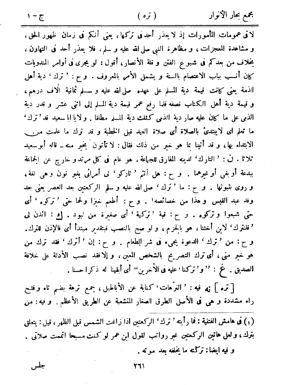 لا في عمومات المأمورات إذ لا يعذر أحد في تركها، يعني أنكم في زمان ظهور الحق، ومشاهدة المعجزات، ومظاهرة النبي صلى الله عليه وسلم، فلا يعذر أحد في التهاون، بخلاف من بعدكم في شيوع الفتن وقلة الأنصار، أقول: لو يجري في أوامر المندوبات كان أنسب بباب الاعتصام بالسنة ويشمل الأمر بالمعروف. وح: "ترك" دية أهل الذمة يعني كانت قيمة دية المسلم على عهده صلى الله عليه وسلم ثمانية آلاف درهم، وقيمة دية اهل الكتاب نصفه فلما رفع عمر قيمة دية المسلم إلى اثني عشر وقدر دية الذمي على ما كان عليه صار دية الذمي كثلث دية المسلم مطلقاً. ولا يا أبا سعيد قد "ترك" ما تعلم أي لا يبتدئ بالصلاة أي صلاة العيد قبل الخطبة وقد ترك ما علمت من الابتداء بها، وقد أتينا بما هو خير من ذلك فقال: لا تأتون بخير منه- قاله أبو سعيد ثلاثاً. ن: "التارك" لدينه المفارق للجماعة، هو عام في كل مرتد وخارج عن الجماعة ببدعة أو بغي أو غيرهما. وح: هل أنتم "تاركو" لي أمرائي بغير نون وهي لغة، وروى بثبوتها. وح: ما "ترك" صلى الله عليه وسلم الركعتين بعد العصر يعني بعد وفد عبد القيس وهذا من خصائصه. وح: أطعم خبزاً ولحماً حتى "تركوه" أي حتى شبعوا وتركوه. وح: قبة "تركية" أي صغيرة من لبود. ك: ائذن لي "فلنترك" لابن أختنا، هو بالجزم، ولو صح بالنصب فبتقدير مبتدأ أي فالإذن للترك. وح: من "ترك" الدعوى يجيء في شر الطعام. وح: إن "أترك" فقد ترك من هو خير مني، أي ترك التصريح بالشخص المعين، وإلا فقد نصب الأدلة على خلافة الصديق. غ: "و"تركنا" عليه في الآخرين" أي أبقينا له ذكراً حسناً.
