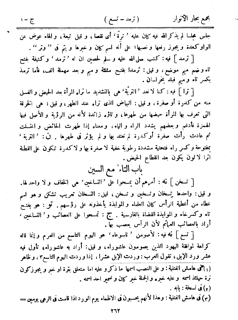 [تسخن] نه: أمرهم أن يمسحوا على "التساخين" هي الخفاف ولا واحد لها. وقيل: واحدها تسخان وتسخين وتسخن، قيل: التسخان تعريب تشكن وهو اسم غطاء من أغطية الرأس كان العلماء والموابذة يأخذونه على رؤسهم. تو: هو بفتح تاء وكسر خاء والموابذة القضاة بالفارسية. ج: تمسحوا على العصائب و"التساخين" أراد بالعصائب العمائم لأن الرأس يعصب بها.