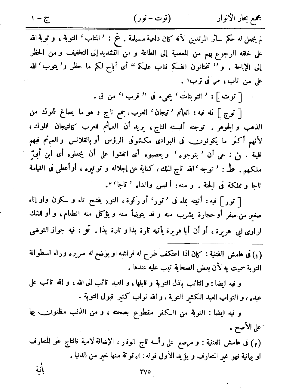 [توجي نه فيه: العمائم "تيجان" العرب، جمع تاج وهو ما يصاغ للملوك من الذهب والجوهر. توجته ألبسته التاج، يريد أن العمائم للعرب كالتيجان للملوك، لأنهم أكثر ما يكونون في البوادي مكشوفي الرؤس أو بالقلانس والعمائم فيهم قليلة. ن: على أن "يتوجوه" ويعصبوه أي اتفقوا على أن يجعلوه أي ابن أبي ملكهم. ط: "توجه" الله تاج الملك، كناية عن إجلاله وتوقيره، أو أعطى في القيامة تاجاً ومملكة في الجنة. ومنه: ألبس والداه "تاجاً".