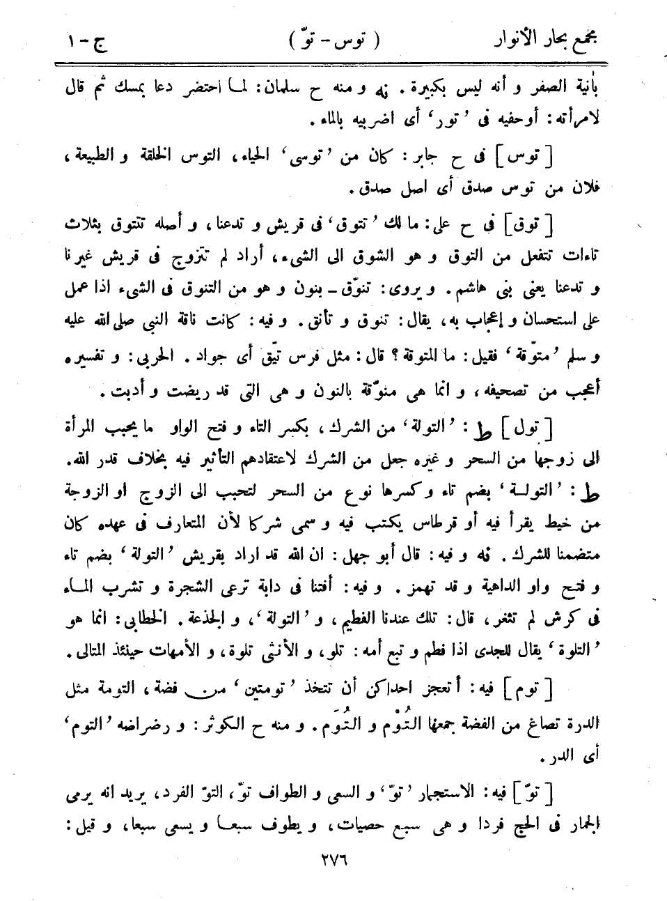 [تو] فيه: الاستجمار "تو" والسعي والطواف تو، التو الفرد، يريد أنه يرمي الجمار في الحج فرداً وهي سبع حصيات، ويطوف سبعاً ويسعى سبعاً، وقيل: