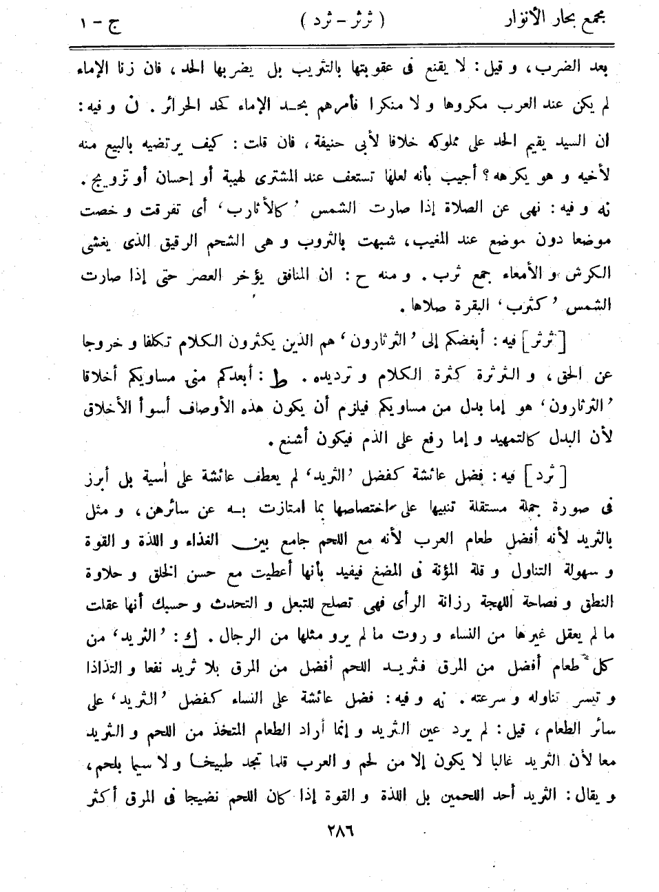[ثرد] فيه: فضل عائشة كفضل "الثريد" لم يعطف عائشة على أسية بل أبرز في صورة جملة مستقلة تنبيها على اختصاصها بما امتازت به عن سائرهن، ومثل بالثريد لأنه أفضل طعام العرب لأنه مع اللحم جامع بين الغذاء واللذة والقوة وسهولة التناول وقلة المؤنة في المضغ فيفيد بأنها أعطيت مع حسن الخلق وحلاوة النطق وفصاحة اللهجة رزانة الرأي فهي تصلح للتبعل والتحدث وحسبك أنها عقلت ما لم يعقل غيرها من النساء وروت ما لم يرو مثلها من الرجال. ك: "الثريد" من كل طعام أفضل من المرق فثريد اللحم أفضل من المرق بلا ثريد نفعاً والتذاذا وتيسر تناوله وسرعته. نه وفيه: فضل عائشة على النساء كفضل "الثريد" على سائر الطعام، قيل: لم يرد عين الثريد وإنما أراد الطعام المتخذ من اللحم والثريد معاً لأن الثريد غالباً لا يكون إلا من لحم والعرب قلما تجد طبيخاً ولاسيما بلحم، ويقال: الثريد أحد اللحمين بل اللذة والقوة إذا كان اللحم نضيجاً في المرق أكثر