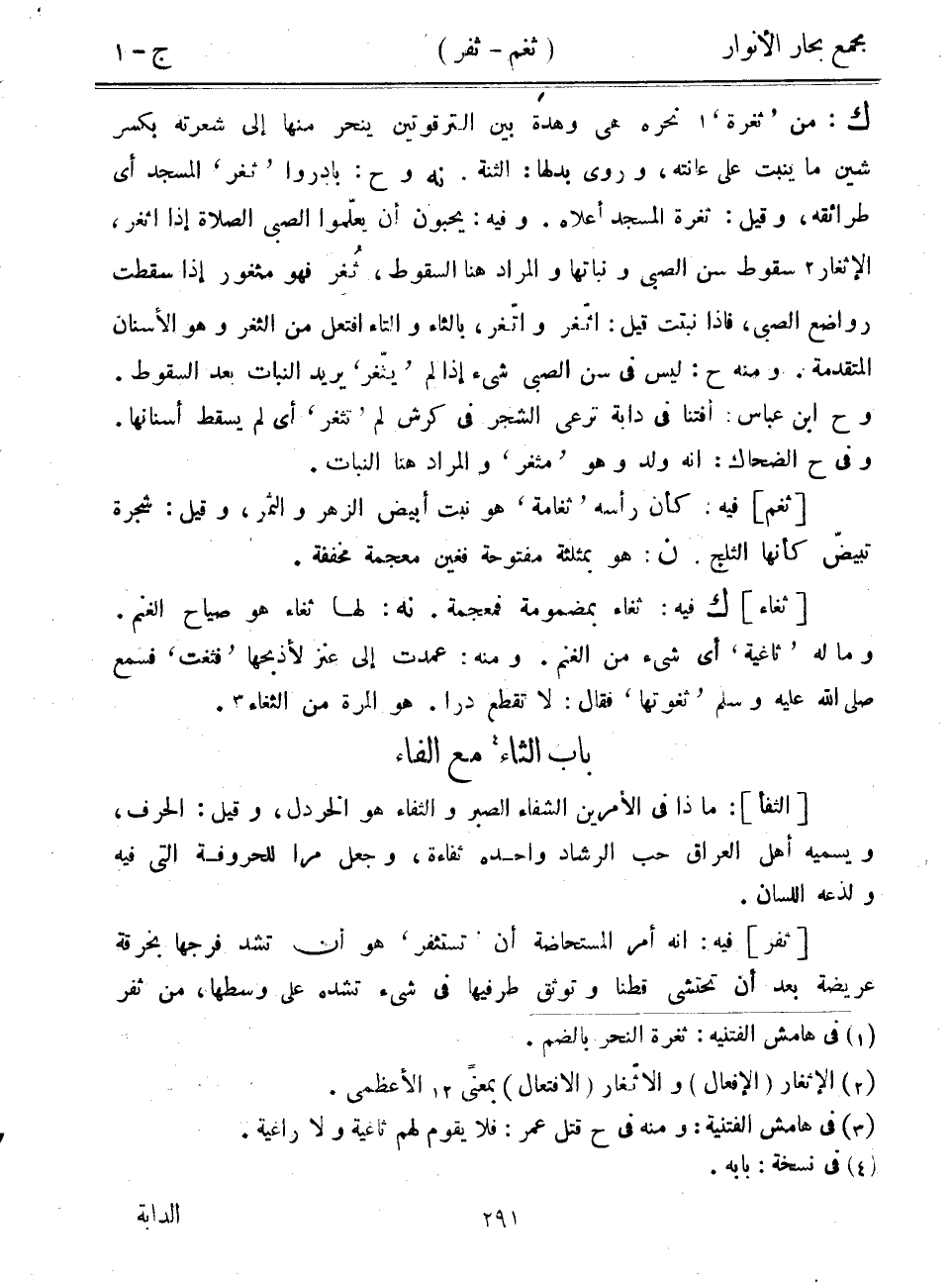 ك: من "ثغرة" نحره هي وهدة بين الترقوتين ينحر منها إلى شعرته بكسر شين ما ينبت على عانته، ورى بدلها: الثنة. نه وح: بادروا "ثغر" المسجد أي طرائقه، وقيل: ثغرة المسجد أعلاه. وفيه: يحبون أن يعلموا الصبي الصلاة إذا أثغر، الإثغار سقوط سن الصبي ونباتها والمراد هنا السقوط، ثغر فهو مثغور إذا سقطت رواضع الصبي، فإذا نبتت قيل: أثغر واتغر، بالثاء والتاء افتعل من الثغر وهو الأسنان المتقدمة. ومنه ح: ليس في سن الصبي شيء إذا لم "يتغر" يريد النبات بعد السقوط. وح ابن عباس: افتنا في دابة ترعى الشجر في كرش لم "تثغر" أي لم يسقط أسنانها. وفي ح الضحاك: أنه ولد وهو "مثغر" والمراد هنا النبات.