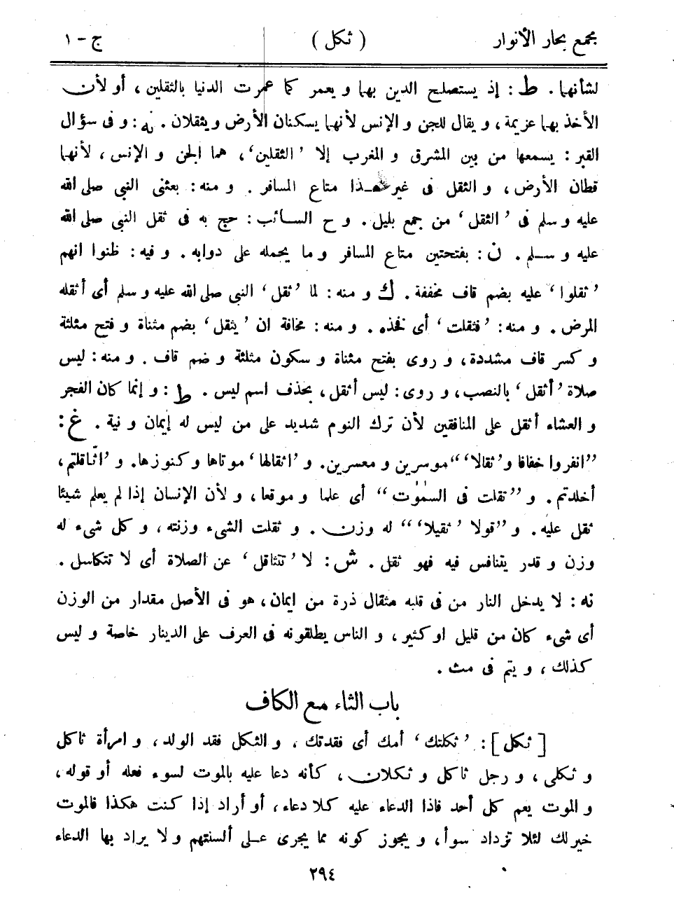 لشأنهما. ط: إذ يستصلح الدين بهما ويعمر كما عمرت الدنيا بالثقلين، أو لأن الأخذ بهما عزيمة، ويقال للجن والإنس لأنهما يسكنان الأرض ويثقلان. نه: وفي سؤال القبر: يسمعها من بين المشرق والمغرب إلا "الثقلين"، هما الجن والإنس، لأنهما قطان الأرض، والثقل في غير هذا متاع المسافر. ومنه: بعثني النبي صلى الله عليه وسلم في "الثقل" من جمع بليل. وح السائب: حج به في ثقل النبي صلى الله عليه وسلم. ن: بفتحتين متاع المسافر وما يحمله على دوابه. وفيه: ظنوا أنهم "ثقلوا" عليه بضم قاف مخففة. ك ومنه: لما "ثقل" النبي صلى الله عليه وسلم أي أثقله المرض. ومنه: "فثقلت" أي فخذه. ومنه: مخافة أن "يثقل" بضم مثناة وفتح مثلثة وكسر قاف مشددة، وروى بفتح مثناة وسكون مثلثة وضم قاف. ومنه: ليس صلاة "أثقل" بالنصب، وروى: ليس أثقل، بحذف اسم ليس. ط: وإنما كان الفجر والعشاء أثقل على المنافقين لأن ترك النوم شديد على من ليس له إيمان ونية. غ: "انفروا خفافاً و"ثقالاً"" موسرين ومعسرين. و"أثقالها" موتاها وكنوزها. و"اثاقلتم" أخلدتم. و"تقلت في السموت" أي علما وموقعاً، ولأن الإنسان إذا لم يعلم شيئاً ثقل عليه. و"قولا "ثقيلا" له وزن. وثقلت الشيء وزنته، وكل شيء له وزن وقدر يتنافس فيه فهو ثقل. ش: لا "تتثاقل" عن الصلاة أي لا تتكاسل. نه: لا يدخل النار من في قلبه مثقال ذرة من إيمان، هو في الأصل مقدار من الوزن أي شيء كان من قليل أو كثير، والناس يطلقونه في العرف على الدينار خاصة وليس كذلك، ويتم في مث.