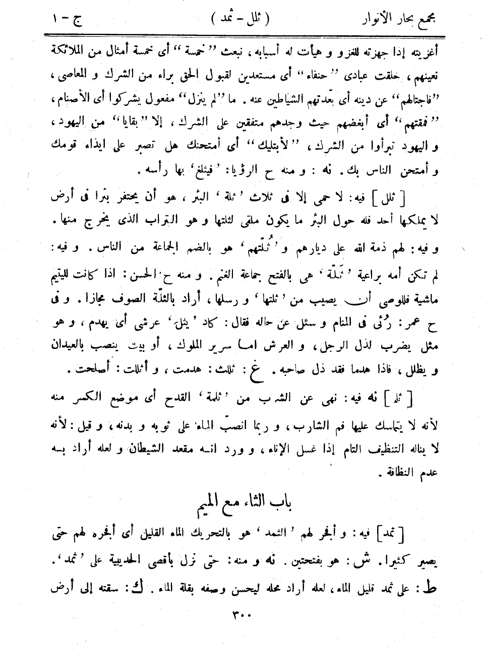 [ثمد] فيه: وأفجر لهم "الثمد" هو بالتحريك الماء القليل أي أفجره لهم حتى يصير كثيراً. ش: هو بفتحتين. نه ومنه: حتى نزل بأقصى الحديبية على "ثمد". ط: على ثمد قليل الماء، لعله أراد محله ليحسن وصفه بقلة الماء. ك: سقته إلى أرض