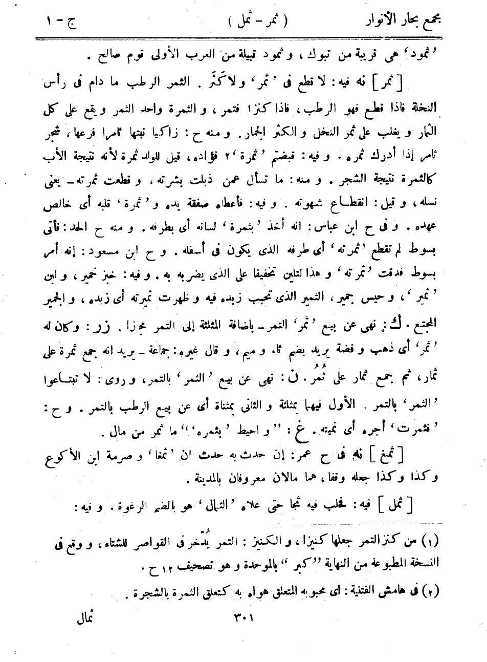 [ثمر] نه فيه: لا قطع في "ثمر" ولا كثر. الثمر الرطب ما دام في رأس النخلة فإذا قطع فهو الرطب، فإذا كنز فتمر، والثمرة واحد الثمرة ويقع على كل الثمار ويغلب على ثمر النخل والكثر الجمار. ومنه ح: زاكياً نبتها ثامراً فرعها، شجر ثامر إذا أدرك ثمره. وفيه: قبضتم "ثمرة" فؤاده، قيل للولد ثرة لأنه نتيجة الأب كالثمرة نتيجة الشجر. ومنه: ما تسأل عمن ذبلت بشرته، وقطعت ثمرته- يعني نسله، وقيل: انقطاع شهوته. وفيه: فأعطاه صفقة يده و"ثمرة" قلبه أي خالص عهده. وفي ح ابن عباس: أنه أخذ "بثمرة" لسانه أي بطرفه. ومنه ح الحد: فأتى بسوط لم تقطع "ثمرته" أي طرفه الذي يكون في أسفله. وح ابن مسعود: إنه أمر بسوط فدقت "ثمرته" وهذا لتلين تخفيفاً على الذي يضربه به. وفيه: خبز خمير، ولبن "ثمير"، وحيس جمير، الثمير الذي تحبب زبده فيه وظهرت ثميرته أي زبده، والجمير المجتع. ك: نهى عن بيع "ثمر"- التمر- بإضافة المثلثة إلى التمر مجازاً. زر: وكان له "ثمر" أي ذهب وفضة يريد بضم ثاء وميم، وقال غيره: جماعة- يريد أنه جمع ثمرة على ثمار، ثم جمع ثمار على ثمر. ن: نهى عن بيع "الثمر" بالتمر، وروى: لا تبتاعوا "الثمر" بالتمر. الأول فيهما بمثلثة والثاني بمثناة أي عن بيع الرطب بالتمر. وح: "فثمرت" اجره أي نميته. غ: "وأحيط "بثمره"" ما ثمر من مال.