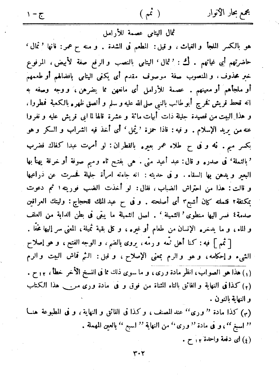 هو بالكسر الملجأ والغياث، وقيل: المطعم في الشدة. ومنه ح عمر: فإنها "ثمال" حاضرتهم أي غياثهم. ك: "ثمال" اليتامى بالنصب والرفع صفة لأبيض، المرفوع خبر محذوف، والمنصوب صفة موصوف مقدم أي يكفي اليتامى بأفضالهم أو طعمهم أو ملجأهم أو معينهم. عصمة للأرامل أي مانعهن مما يضرهن، ووجه وصفه به أنه قحط قريش فخرج أبو طالب بالنبي صلى الله عليه وسلم وألصق ظهره بالكعبة فمطروا، وهذا البيت من قصيدة جليلة ذات أبيات مائة وعشرة قالها لما أبى قريش عليه ونفروا عنه من يريد الإسلام. وفيه: فإذا حمزة "ثمل" أي أخذ فيه الشراب والسكر وهو بكسر ميم. نه وفي ح طلاء عمر بعيره بالقطران: لو أمرت عبدا كفاك فضرب "بالثملة" في صدره وقال: عبد أعبد منى. هي بفتح ثاء وميم صوفة أو خرقة يهنأ بها البعير ويدهن بها السقاء. وفي حديثه: أنه جاءته امرأة جليلة فحسرت عن ذراعيها وقالت: هذا من احتراش الضباب، فقال: لو أخذت الضب فوريته ثم دعوت بمكتفة فثملته كان أشبع أي أصلحته. وفي ح عبد الملك للحجاج: وليتك العراقين صدمة فسر إليها منطوي "الثميلة". أصل الثميلة ما يبقى في بطن الدابة من العلف والماء، وما يدخره الإنسان من طعام أو غيره، وكل بقية ثميلة، المعنى سر إليها مخفًّا.