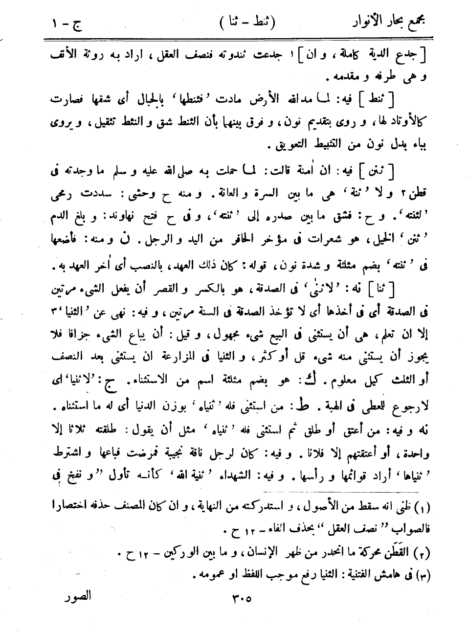 [ثنا] نه: "لاثنى" في الصدقة، هو بالكسر والقصر أن يفعل الشيء مرتين في الصدقة أي في أخذها أي لا تؤخذ الصدقة في السنة مرتين، وفيه: نهى عن "الثنيا" إلا أن تعلم، هي أن يستثنى في البيع شيء مجهول، وقيل: أن يباع الشيء جزافاً فلا يجوز أن يستثنى منه شيء قل أو كثر، والثنيا في المزارعة أن يستثنى بعد النصف أو الثلث كيل معلوم. ك: هو بضم مثلثة اسم من الاستثناء. ج: "لاثنيا" أي لا رجوع للمعطى في الهبة. ط: من استثنى فله "ثنياه" بوزن الدنيا أي له ما استثناه. نه وفيه: من أعتق أو طلق ثم استثنى فله "ثنياه" مثل أن يقول: طلقته ثلاثاً إلا واحدة، أو أعتقتهم إلا فلاناً. وفيه: كان لرجل ناقة نجيبة فمرضت فباعها واشترط "ثنياها" أراد قوائمها ورأسها. وفيه: الشهداء "ثنية الله" كأنه تأول "ونفخ في