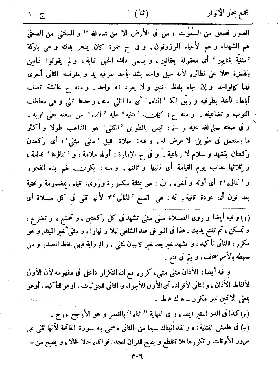 الصور فصعق من السموت ومن في الأرض إلا من شاء الله" والمستثنى من الصعق هم الشهداء وهم الأحياء المرزوقون. وفي ح عمر: كان ينحر بدنته وهي باركة "مثنية بثنايين" أي معقولة بعقالين، ويسمى ذلك الحبل ثناية، ولم يقولوا ثناءين بالهمزة حملاً على نظائره لأنه حبل واحد يشد بأحد طرفيه يد وبطرفه الثاني أخرى فهما كالواحد وإن جاء بلفظ اثنين ولا يفرد له واحد. ومنه ح عائشة تصف أباها: فأخذ بطرفيه وربق لكم "أثناءه" أي ما انثنى منه، واحدها ثنى وهي معاطف الثوب وتضاعيفه. ومنه ح: كان "يثنيه" عليه "أثناء" من سعته يعني ثوبه. وفي صفته صلى الله عليه وسلم: ليس بالطويل "المتثنى" هو الذاهب طولاً وأكثر ما يستعمل في طويل لا عرض له. وفيه: صلاة الليل "مثنى مثنى" أي ركعتان ركعتان بتشهد وسلام لا رباعية. وفي ح الإمارة: أولها ملامة، و"ثناؤها" ندامة، وثلاثها عذاب يوم القيامة أي ثانيها وثالثها. ومنه: يكون لهم بدء الفجور و"ثناؤه" أي أوله وآخره. ن: هو بمثلثة مكسورة وروى: ثنياه، بمضمومة وتحتية بعد نون أي عودة ثانية. نه: هي السبع "المثاني" لأنها تثنى في كل صلاة أي