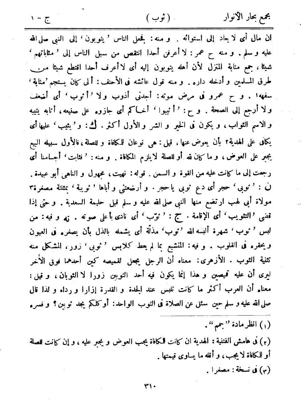 أن مال أي لا يعاد إلى استوائه. ومنه: فجعل الناس "يثوبون" إلى النبي صلى الله عليه وسلم. ومنه ح عمر: لا أعرفن أحداً انتقص من سبل الناس إلى "مثاباتهم" شيئاً، جمع مثابة المنزل لأن أهله يثوبون إليه أي لا أعرف أحداً اقتطع شيئاً من طرق المسلمين وأدخله داره. ومنه قول عائشة في الأحنف: إلى كان يستجم "مثابة" سفهه. وح عمرو في مرض موته: أجدني أذوب ولا "أثوب" أي أضعف ولا أرجع إلى الصحة. وح: "أثيبوا" أخاكم أي جازوه على صنيعه، أثابه يثيبه والاسم الثواب، ويكون في الخير والشر والأول أكثر. ك: "ويثيب" عليها أي يكافي على الهدية بأن يعوض عنها، قيل: هي نوعان للمكافاة وللصلة، فالأول سبيله البيع يجبر على العوض، وما كان لله أو للصلة لا يلزم المكافاة. ومنه: "فثابت" أجسامنا أي رجعت على ما كانت عليه من القوة والسمن. قوله: نهيت، مجهول والناهي أبو عبيدة. ن: "ثوبي" حجر أي دع ثوبي يا حجر. وأرضعتني وأباها "ثويبة" بمثلثة مصغرة مولاة أبي لهب ارتضع منها النبي صلى الله عليه وسلم قبل حليمة السعدية. وحتى إذا قضى "التثويب" أي الإقامة. ج: "ثوب" أي نادى بأعلى صوته. نه وفيه: من لبس "ثوب" شهرة ألبسه الله "ثوب" مذلة أي يشمله بالذل بأن يصغره في العيون ويحقره في القلوب. وفيه: المتشبع بما لم يعط كلابس "ثوبي" زور، المشكل منه تثنية الثوب. الأزهري: معناه أن الرجل يجعل لقميصه كمين أحدهما فوق الآخر ليرى أن عليه قميصين وهذا إنما يكون فيه أحد الثوبين زوراً لا الثوبان، وقيل: معناه أن العرب أكثر ما كانت تلبس عند الجدة والقدرة إزاراً ورداء ولذا قال صلى الله عليه وسمل حين سئل عن الصلاة في الثوب الواحد: أو كلكم يجد ثوبين؟ وفسره