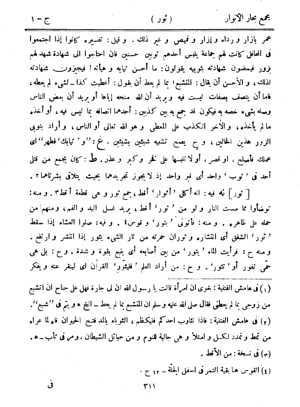 [ثور] نه فيه: أنه أكل "أثوار" أقط، جمع ثور وهي قطعة أقط. ومنه: توضأوا مما مست النار ولو من "ثور" أقط، يريد غسل اليد والفم، ومنهم من حمله على ظاهره. ومنه: فأتوني "بثور" وقوس. وفيه: صلوا العشاء إذا سقط "تور" الشفق أي انتشاره وثوران حمرته من ثار الشيء يثور إذا انتشر وارتفع. ومنه ح: فرأيت الماء "يثور" من بين أصابعه أن ينبع بقوة وشدة. وح: بل هي حمى تفور أو "تثور". وح: من أراد العلم "فليثور" القرآن أي لينقر عنه ويفكر