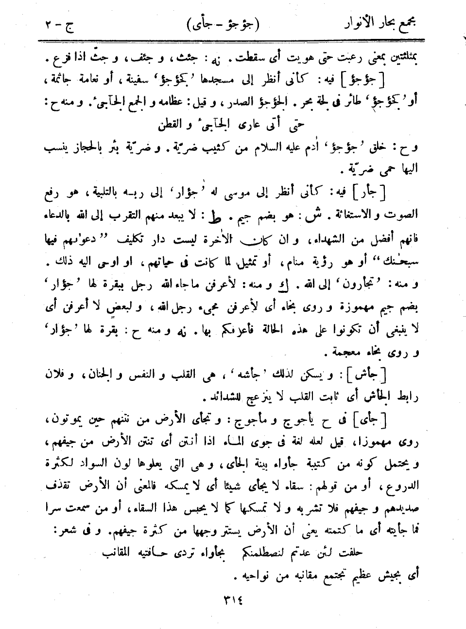[جأر] فيه: كأني أنظر إلى موسى له "جؤار" إلى ربه بالتلبية، هو رفع الصوت والاستغاثة. ش: هو بضم جيم. ط: لا يبعد منهم التقرب إلى الله بالدعاء فإنهم أفضل من الشهداء، وأن كان الآخرة ليست دار تكليف "دعواهم فيها سبحانك" أو هو رؤية منام، أو تمثيل لما كانت في حياتهم، أو أوحى إليه ذلك. ومنه: "تجأرون" إلى الله. ك ومنه: لأعرفن ما جاء الله رجل ببقرة لها "جؤار" بضم جيم مهموزة وروى بخاء أي لأعرفن مجيء رجل الله، ولبعض لا أعرفن أي لا ينبغي أن تكونوا على هذه الحالة فأعرفكم بها. نه ومنه ح: بقرة لها "جؤار" وروى بخاء معجمة.