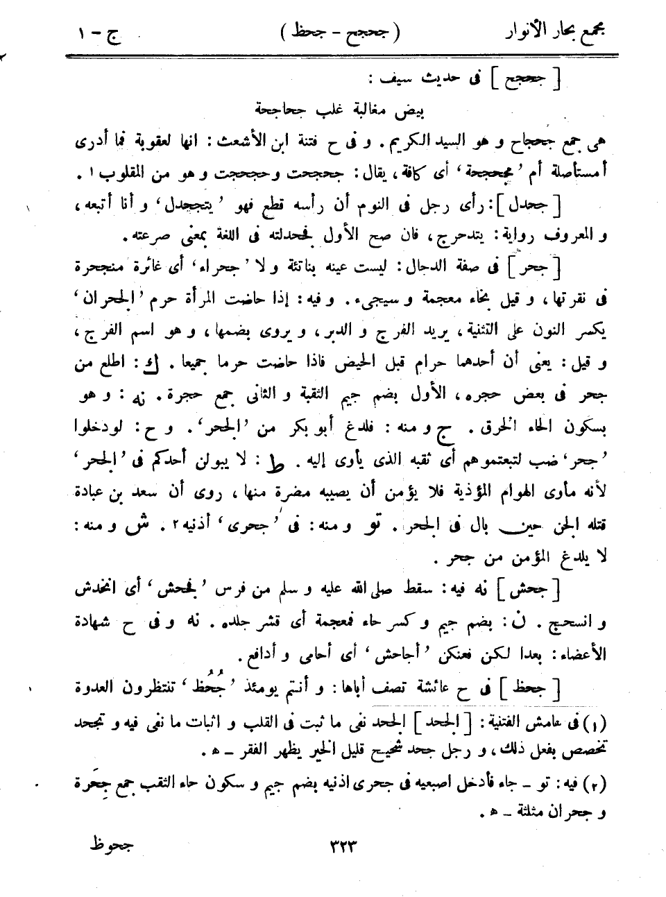 [جحر] في صفة الدجال: ليست عينة بناتئة ولا "جحراء" أي غائرة منجحرة في نفرتها، وقيل بخاء معجمة وسيجيء. وفيه: إذا حاضت المرأة حرم "الجحران" يكسر النون على التثنية، يريد الفرج والدبر، ويروي بضمها، وهو اسم الفرج، وقيل: يعني أن أحدهما حرام قبل الحيض فإذا حاضت حرماً جميعاً. ك: اطلع من جحر في بعض حجره، الأول بضم جيم الثقبة والثاني جمع حجرة. نه: وهو بسكون الحاء الحرق. ج ومنه: فلدغ أبو بكر من "الجحر". وح: لو دخلوا "جحر" ضب لتبعتموهم أي ثقبه الذي يأوى إليه. ط: لا يبولن أحدكم في "الجحر" لأنه مأوى الهوام المؤذية فلا يؤمن أن يصيبه مضرة منها، روى أن سعد بن عبادة قتله الجن حين بال في الجحر. تو ومنه: في "جحري" أذنيه. ش ومنه: لا يلدغ المؤمن من جحر.