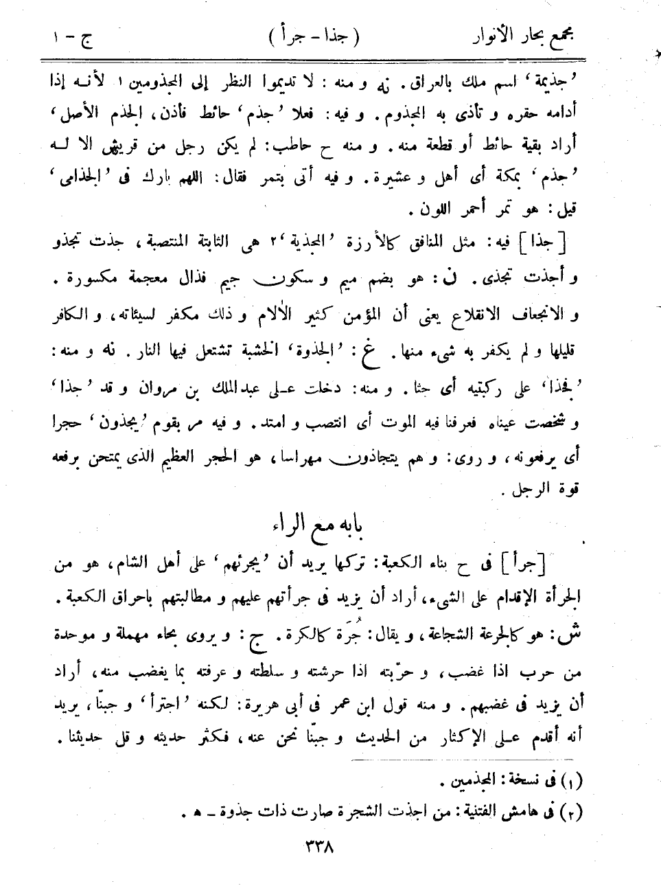 [جذا] فيه: مثل المنافق كالأرزة "المجذية" هي الثابتة المنتصبة، جذت تجذو وأجذت تجذي. ن: هو بضم ميم وسكون جيم فذال معجمة مكسورة. والانجعاف الانقلاع يعني أن المؤمن كثير الآلام وذلك مكفر لسيئاته، والكافر قليلها ولم يكفر به شيء منها. غ: "الجذوة" الخشبة تشتعل فيها النار. نه ومنه: "فجذا" على ركبتيه أي جثا. ومنه: دخلت على عبد الملك بن مروان وقد "جذا" وشخصت عيناه فعرفنا فيه الموت أي انتصب وامتد. وفيه مر بقوم "يجذون" حجراً أي يرفعونه، وروى: وهم يتجاذون مهراساً، هو الحجر العظيم الذي يمتحن برفعه قوة الرجل.