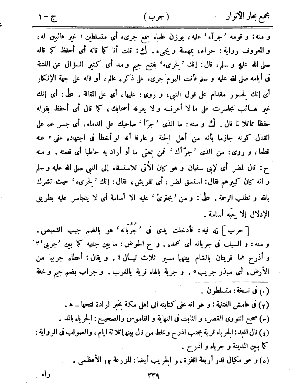 ومنه: وقومه "جرآء" عليه، بوزن علماء جمع جريء أي متسلطين غير هائبين له، والمعروف رواية: حراء، بمهملة ويجيء. ك: قلت أنا كما قاله أي أحفظ كما قاله صلى الله عليه وسلم، قال: إنك "لجريء" بفتح جيم ومد أي كثير السؤال عن الفتنة في أيامه صلى الله عليه وسلم فأنت اليوم جريء على ذكره عالم، أو قاله على جهة الإنكار أي إنك لجسور مقدام على قول النبي، وروى: عليها، أي على المقالة. ط: أي إنك غير هائب تجاسرت على ما لا أعرفه ولا يعرفه أصحابك، كما قال أي أحفظ بقوله حفظاً مماثلاً لما قال. ك ومنه: ما الذي "جرأ" صاحبك على الدماء، أي جسر عليا على القتال كونه جازماً بأنه من أهل الجنة وعارفاً أنه لو أخطأ في اجتهاده عفى عنه قطعاً، وروى: من الذي "جرأك" فمن بمعنى ما أو أراد به حاطباً أي قصته. ومنه ح: قال لمضر أي لأبي سفيان وهو كان الآتي للاستسقاء إلى النبي صلى الله عليه وسلم وأنه كان كبيرهم فقال: استسق لمضر، أي لقريش، فقال: إنك "لجريء" حيث تشرك بالله وتطلب الرحمة. ط: ومن "يجترئ" عليه إلا أسامة أي لا يتجاسر عليه بطريق الإدلال إلا حبه أسامة.