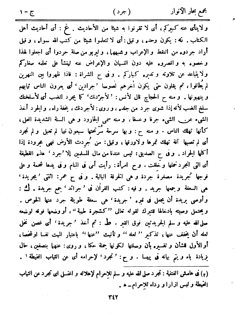 ولا ينأى عنه كبيركم، أي لا تقرنوا به شيئاً من الأحاديث. غ: أي أحاديث أهل الكتاب. نه: يكون وحده، وقيل: أي لا تتعلموا شيئاً من كتب الله سواه، وقيل أراد جردوه من النقط والإعراب وشبههما، وليربو من صلة جردوا أي اجعلوا لهذا وخصوه به واقصروه عليه دون النسيان والإعراض عنه لينشأ على تعلمه صغارمك ولا يتباعد عن تلاوته وتدبره كباركم. وفي ح الشراة: فإذا ظهروا بين النهرين لم يطاقوا، ثم يقلون حتى يكون آخرهم لصوصاً "جرادين" أي يعرون الناس ثيابهم وينهبونها. ومنه ح الحجاج قال لأنس: "لأجردنك" كما يجرد الضب أي لأسلخنك سلخ الضب لأنه إذا شوى جرد من جلده، وروى: لأجردنك، بخفة راء، والجرد أخذ الشيء عن الشيء جرفاً وعسفاً، ومنه سمى الجارود وهي السنة الشديدة المحل، كأنها تهلك الناس. ومنه ح: وبها سرحة سر تحتها سبعون نبياً لم تعبل ولم تجرد أي لم تصبها آفة تهلك ثمرها ولا ورقها، وقيل: من جردت الأرض فهي مجرودة إذا أكلها الجراد. وفي ح الصديق: ليس عندنا من مال المسلمين إلا "جرد" هذه القطيفة أي التي انجرد خملها وخلقت. وح امرأة: رأيت أمي في المنام وفي يدها شحمة وعلى فرجها "جريدة مصغرة جردة وهي الخرقة البالية. وفي ح عمر: ائتني "بجريدة" هي السعفة وجمعها جريد. وفيه: كتب القرآن في "جرائد" جمع جريدة. ك: وأوصى بريدة أن يجعل في قبره "جريدة" هي سعفة طويلة جرد عنها الخوص. ويحتمل وصيته بإدخالها للتبرك لقوله تعالى: {كشجرة طيبة}، أو وضعها فوقه لوضعه صلى الله عليه وسلم الجريدتين فوق القبر. ط: ثم أخذ "جريدة" أي غصن نخل لعله أن يخفف عنها، تذكير "لعله" وتأنيث "عنها" باعتبار الميت نفساً أو شخصاً، أو الأول للشأن وتفسيره بأن وصلتها لكونها جملة حكماً، وروى: عنهماب نصفين، حال بزيادة باء ويتم بيانه في ييبسا. وح: "تجرد" لإحرامه أي عن الثياب المخيطة.