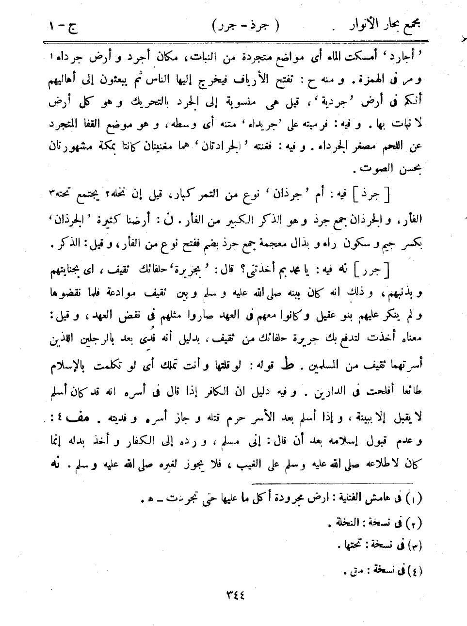 "أجارد" أمسكت الماء أي مواضع متجردة من النبات، مكان أجرد وأرض جرداء ومر في الهمزة. ومنه ح: تفتح الأرياف فيخرج إليها الناس ثم يبعثون إلى أهاليهم أنكم في أرض "جردية"، قيل هي منسوبة إلى الجرد بالتحريك وهو كل أرض لا نبات بها. وفيه: فرميته على "جريداء" متنه أي وسطه، وهو موضع القفا المتجرد عن اللحم مصغر الجرداء. وفيه: فغنته "الجرادتان" هما مغنيتان كانتا بمكة مشهورتان بحسن الصوت.